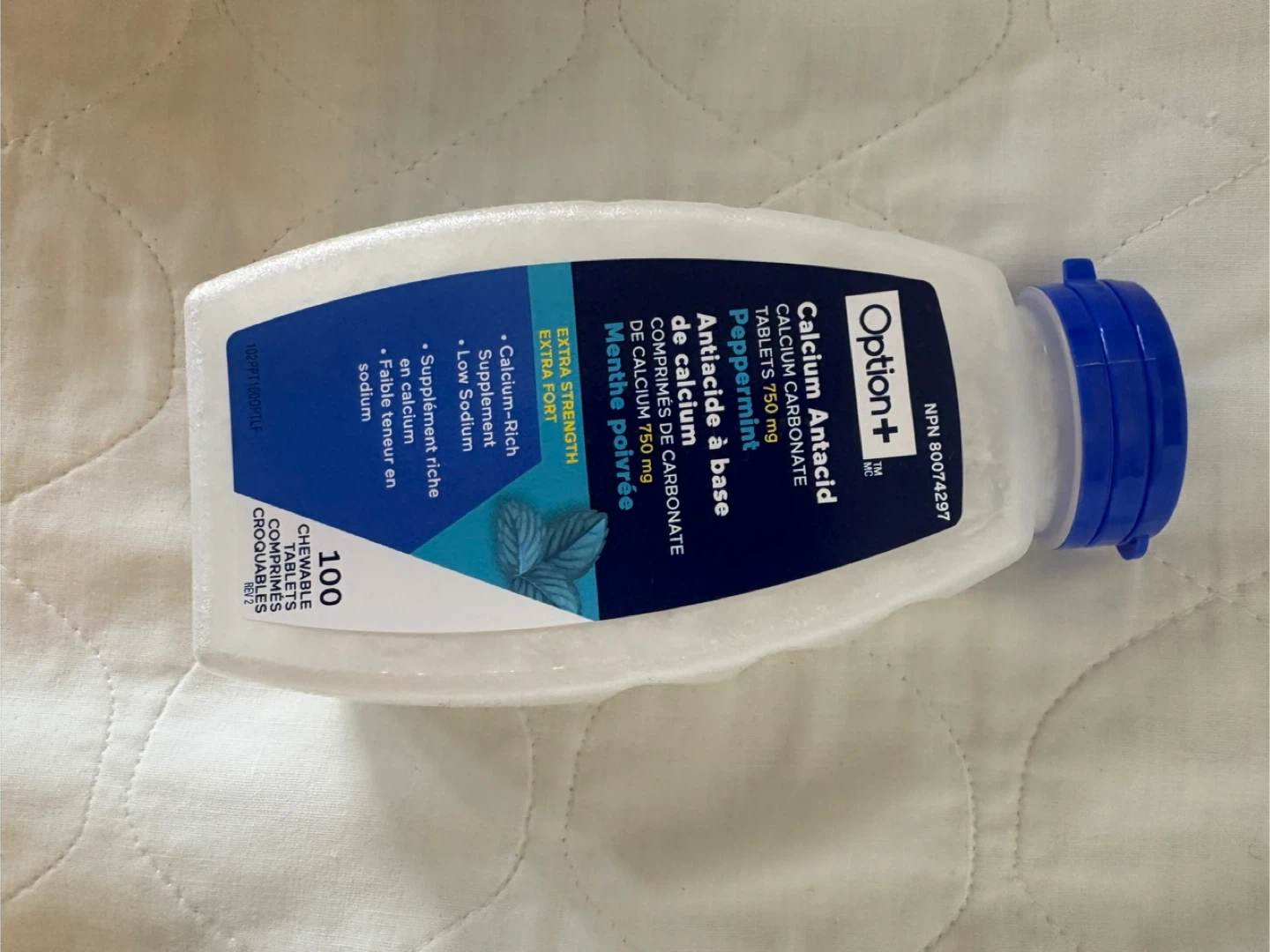 Selling a bottle of Option+ Calcium Antacid tablets. They are peppermint flavoured and each tablet contains 750mg of calcium carbonate. They are chewable and low in sodium.