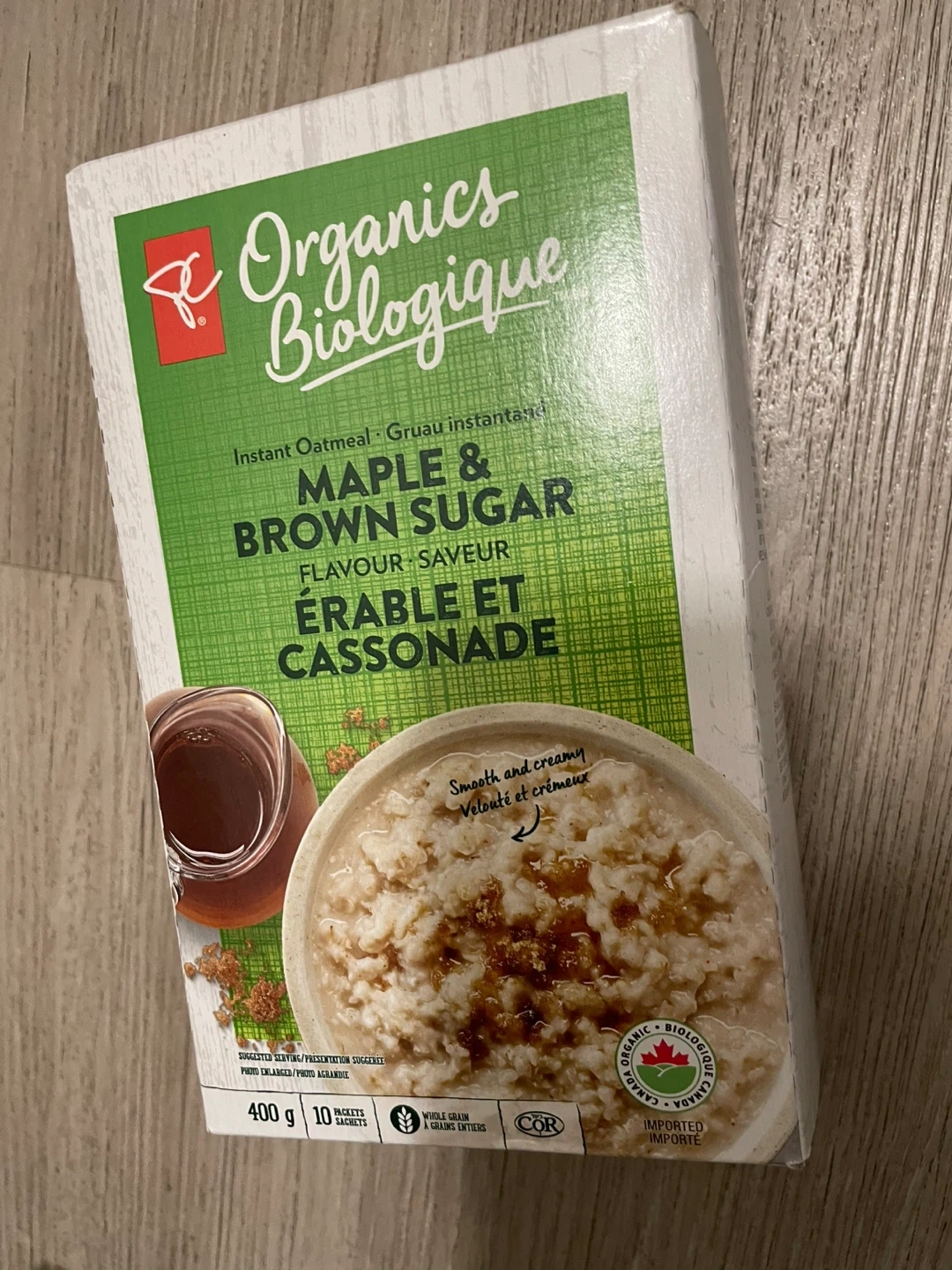 Selling a box of PC Organics Instant Oatmeal in Maple & Brown Sugar flavour! It's a 400g box containing 10 packets of whole grain oatmeal. Perfect for a quick and creamy breakfast