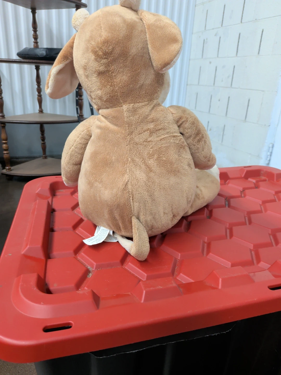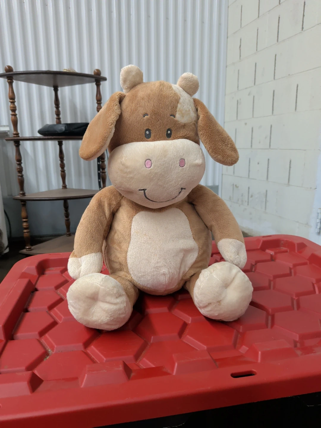 This is a soft, plush cow stuffed animal. It's brown and beige with a friendly face. Perfect for a child's toy collection!