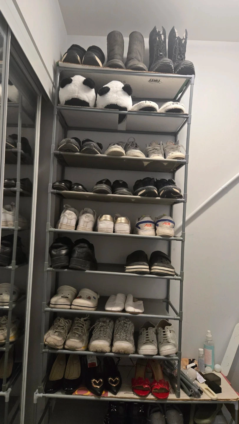 A tall, multi-tiered shoe rack that can hold numerous pairs of shoes. It's made of a metal frame with fabric shelves. This rack is great for organizing footwear in a closet or entryway.