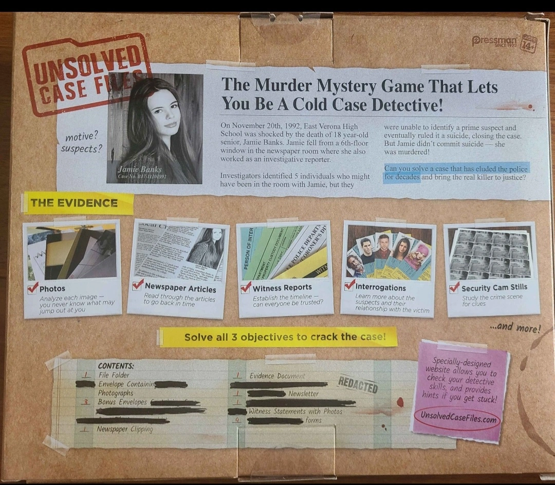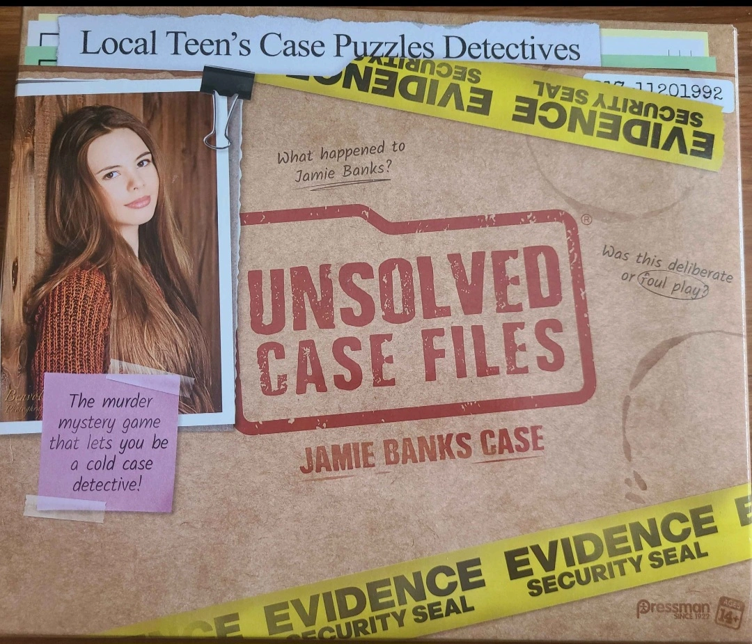 10Brand new, never opened! Solve the murder mystery with Unsolved Case Files: Jamie Banks Case! Become a cold case detective and analyze the evidence to crack the case. Includes photos, newspaper articles, witness reports, interrogations, and security cam stills. Solve all 3 objectives to crack the case!