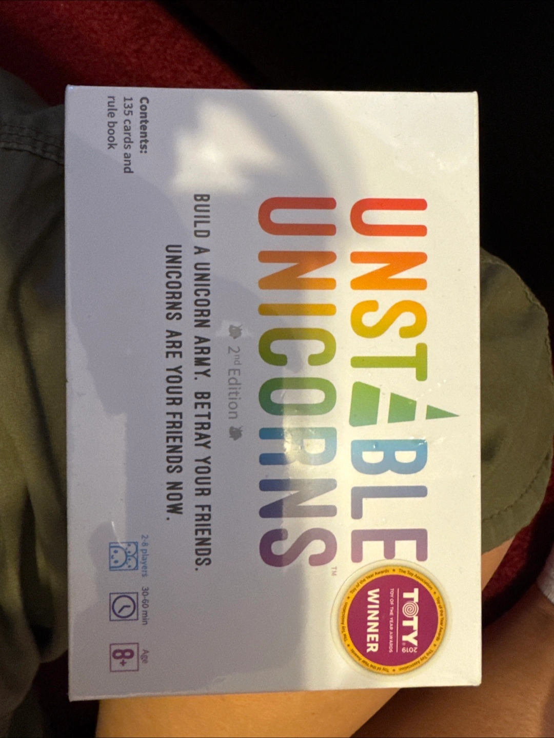 Selling a 2nd Edition of the Unstable Unicorns card game! It's a game where you build a unicorn army and betray your friends! The game includes 135 cards and a rule book. Suitable for 2-8 players, with a playtime of 30-60 minutes, and recommended for ages 8+ Located in Douglasdale