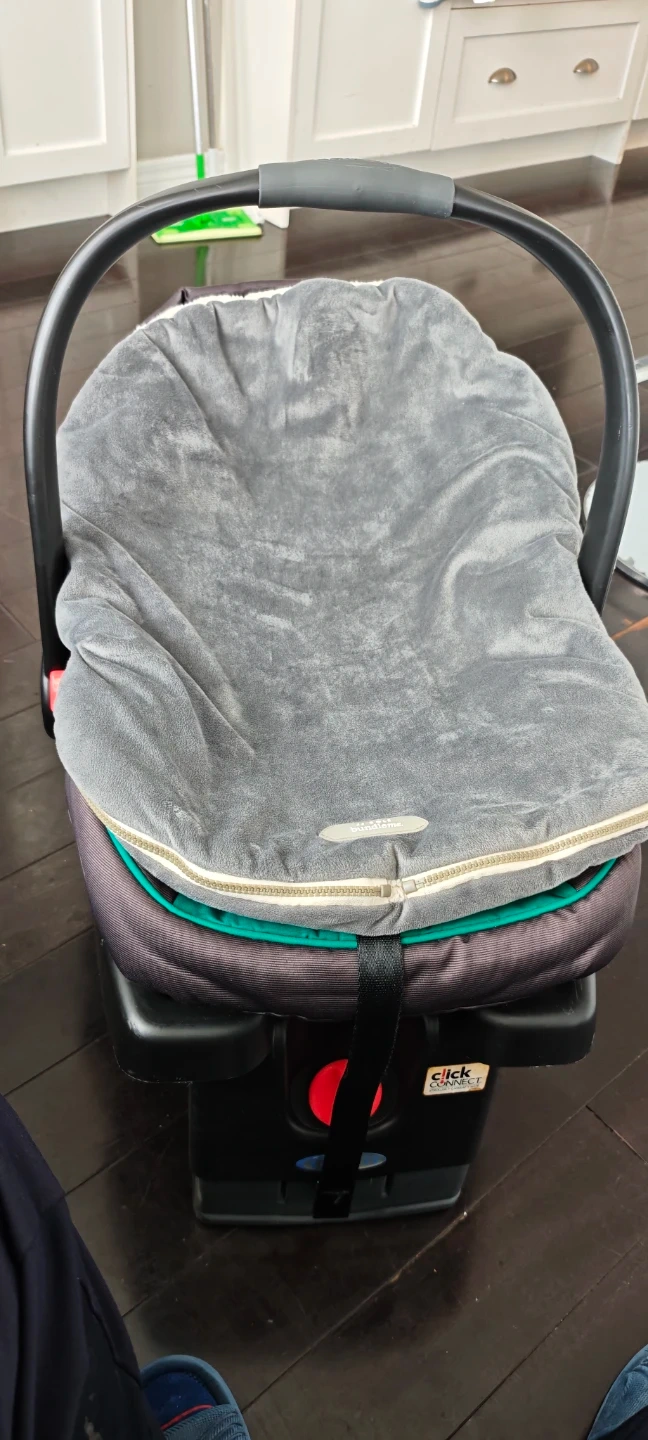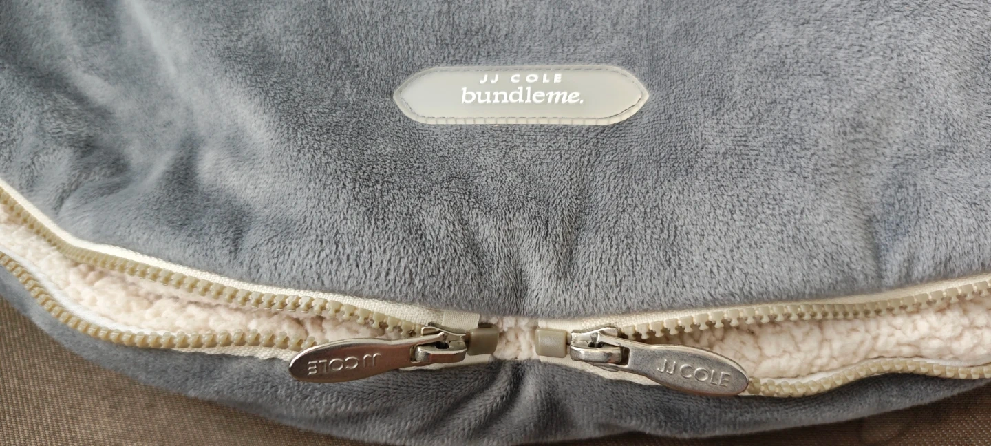 This is a grey fleece lined car seat cover with a plush interior. It's designed to fit most infant car seats, keeping your little one warm and cozy. The cover has a full zipper closure for easy access.