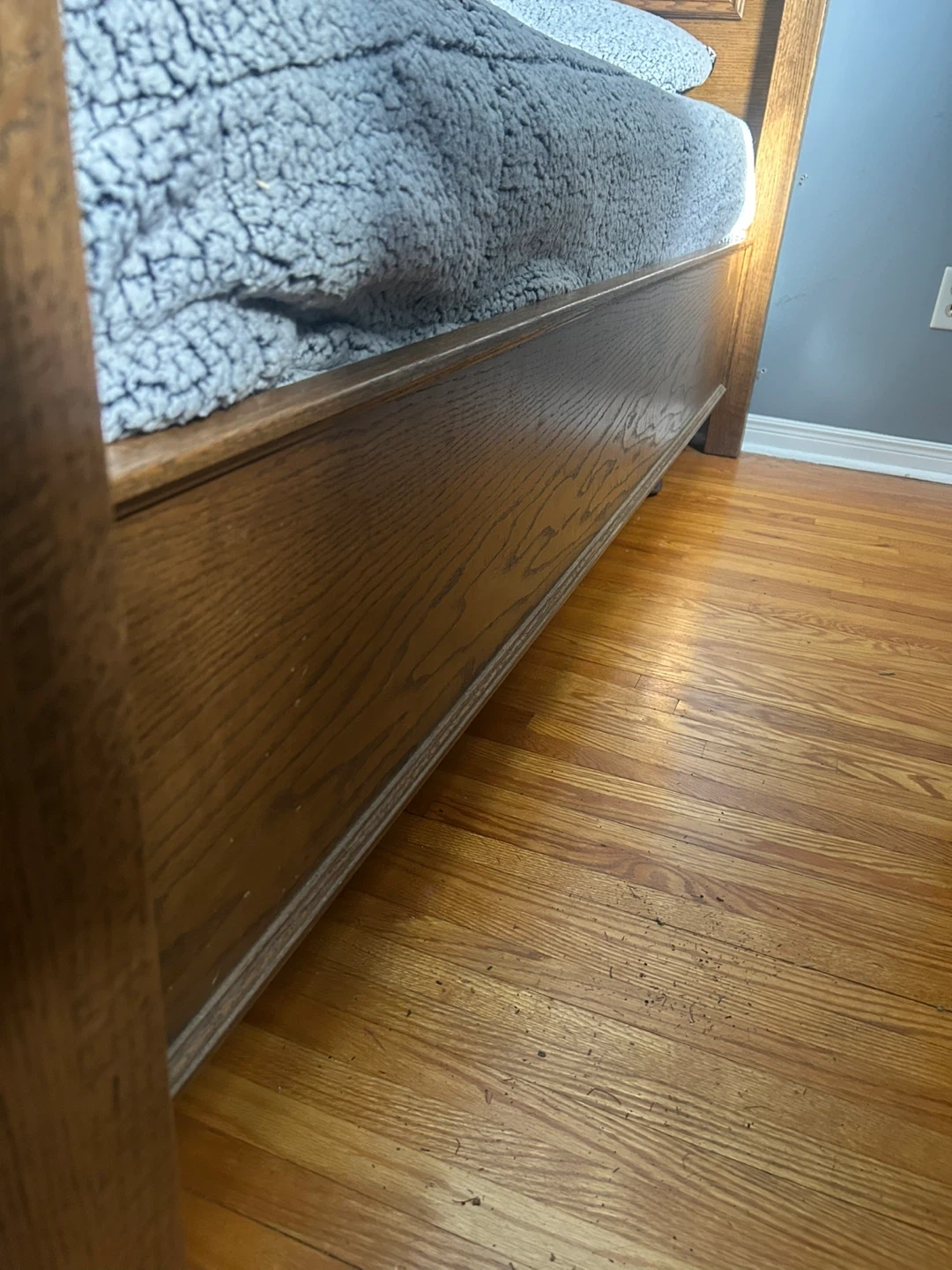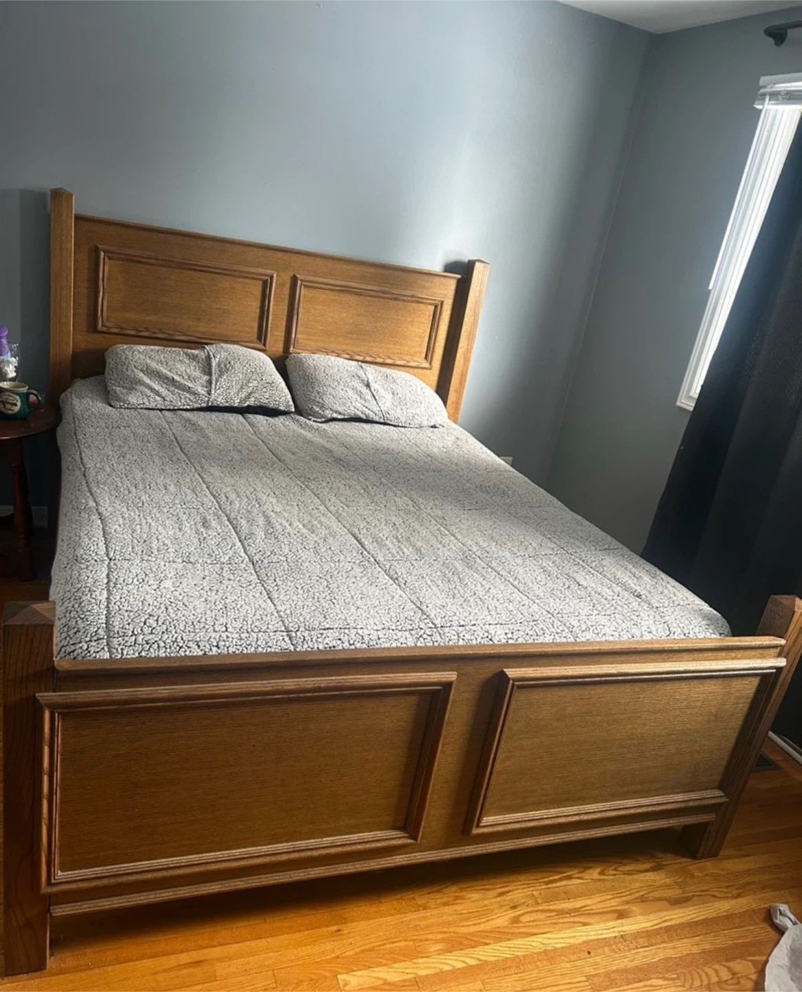 Solid wood bed frame with a warm oak finish. It features a classic design with paneled headboard and footboard. This sturdy bed frame is built to last!