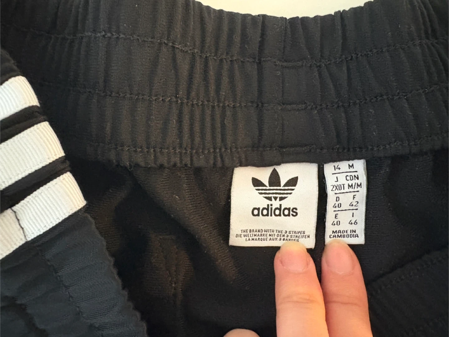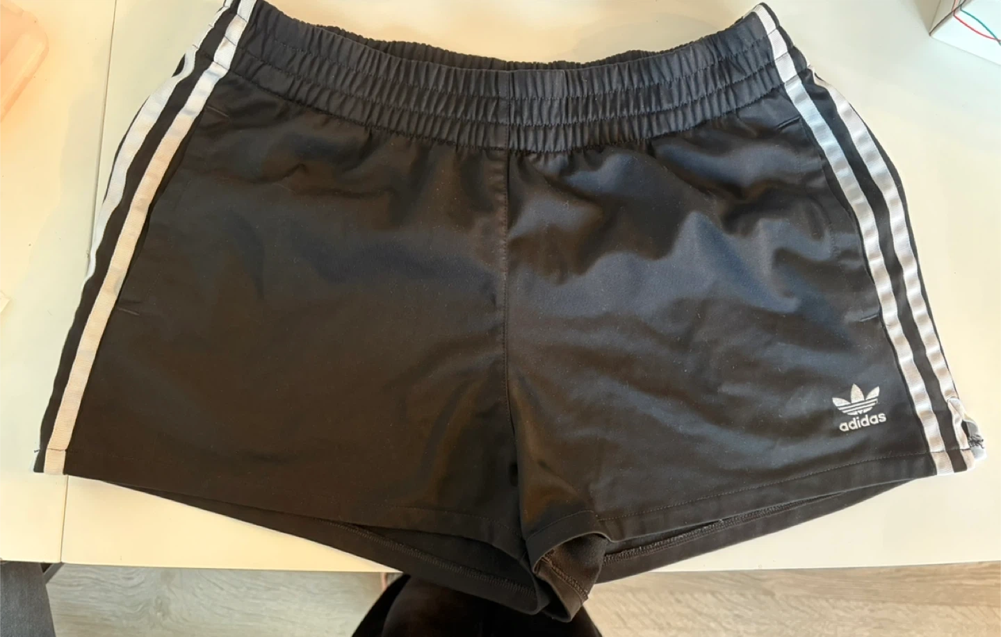 Black athletic shorts from Adidas featuring the classic three white stripes. They're made in Cambodia and have a comfortable elastic waistband. Size is M, which corresponds to a CDN M/M.