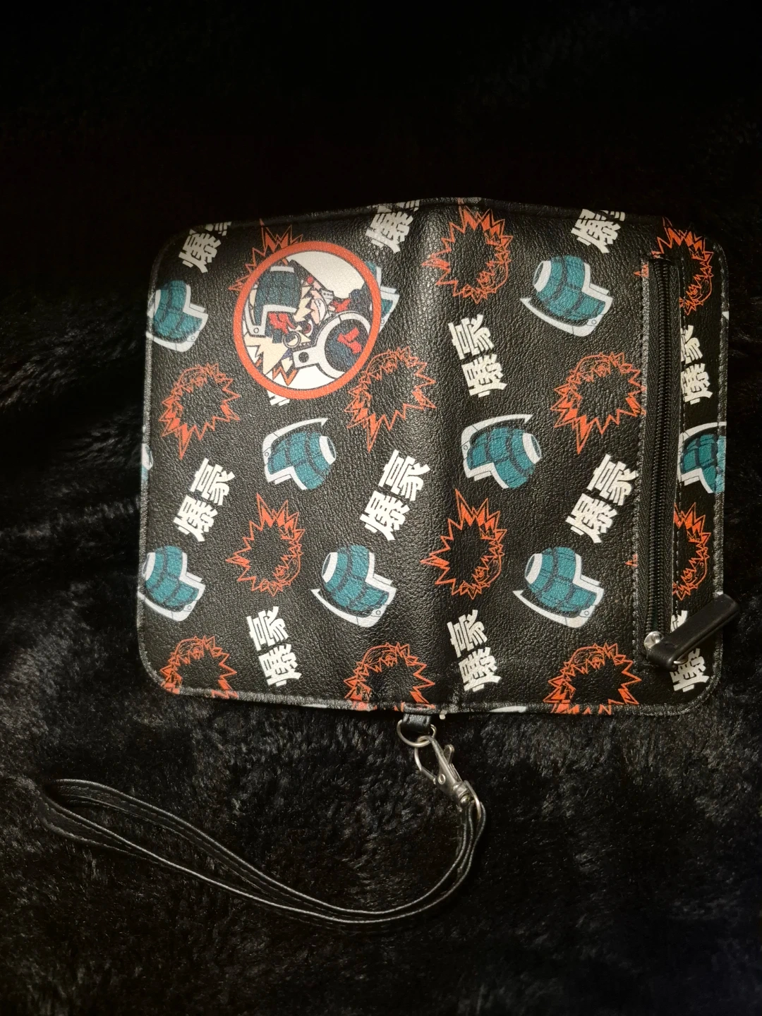 This black bifold wallet features an all-over print with Katsuki Bakugo symbols. It has multiple card slots, a clear ID window, and a zippered coin pocket. A wrist strap is attached for convenience.