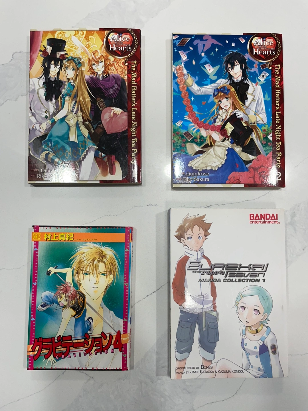Set of four manga volumes, including Alice in the Country of Hearts vol. 1 and 2, Gravitation vol. 4 and Eureka Seven collection vol. 1.