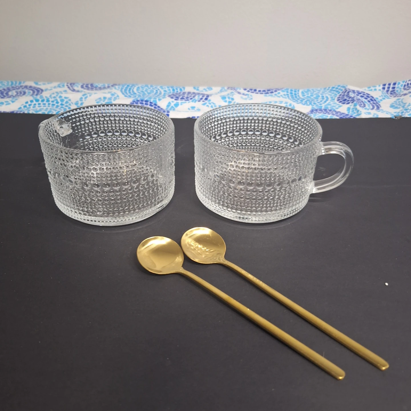 Two clear glass mugs with a textured pattern are included. Two gold-coloured spoons are also part of this set. These mugs are great for enjoying a warm beverage.