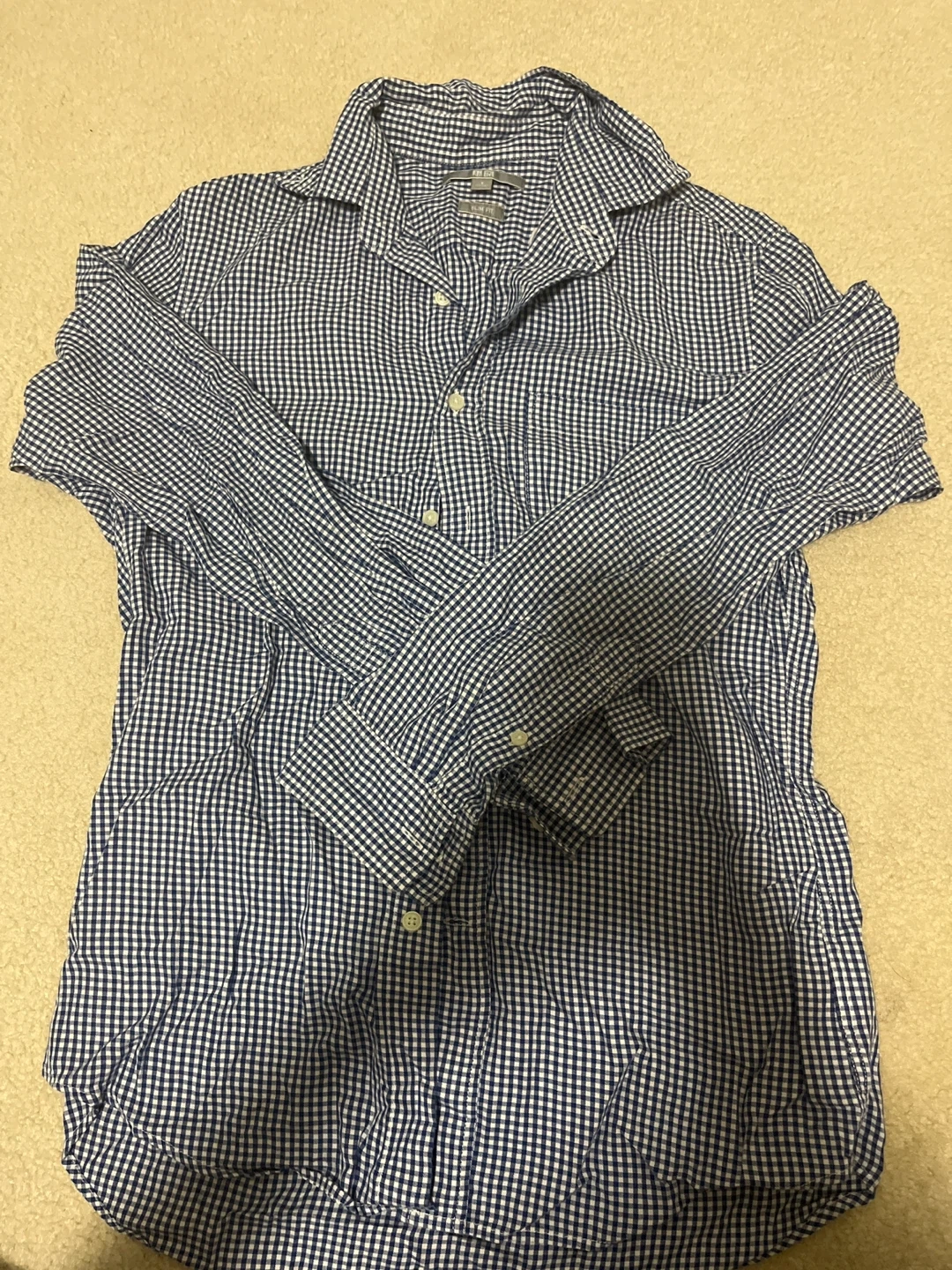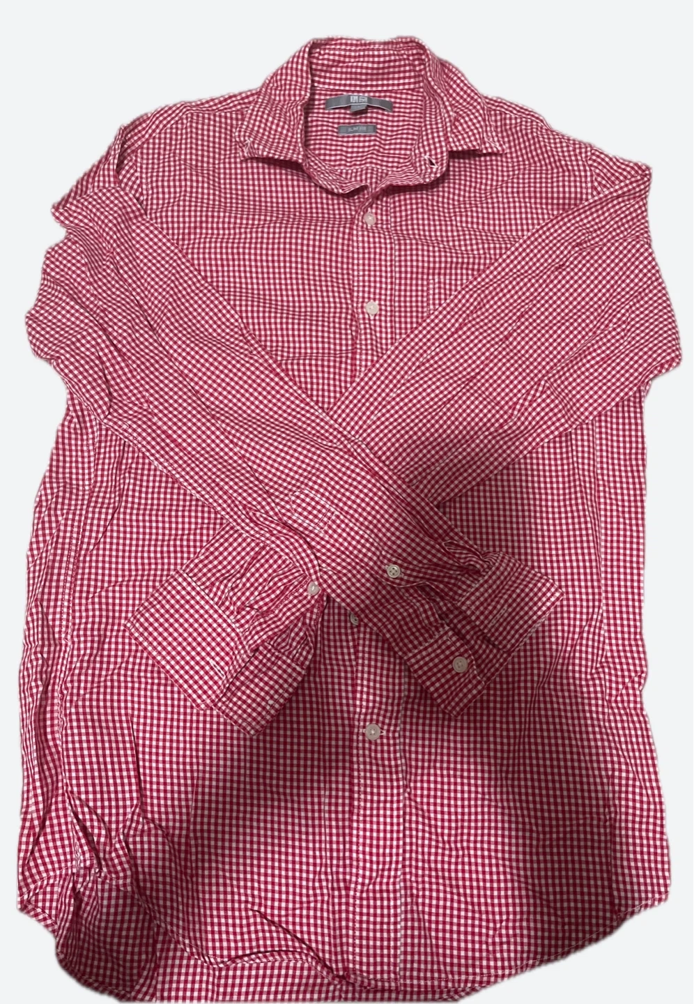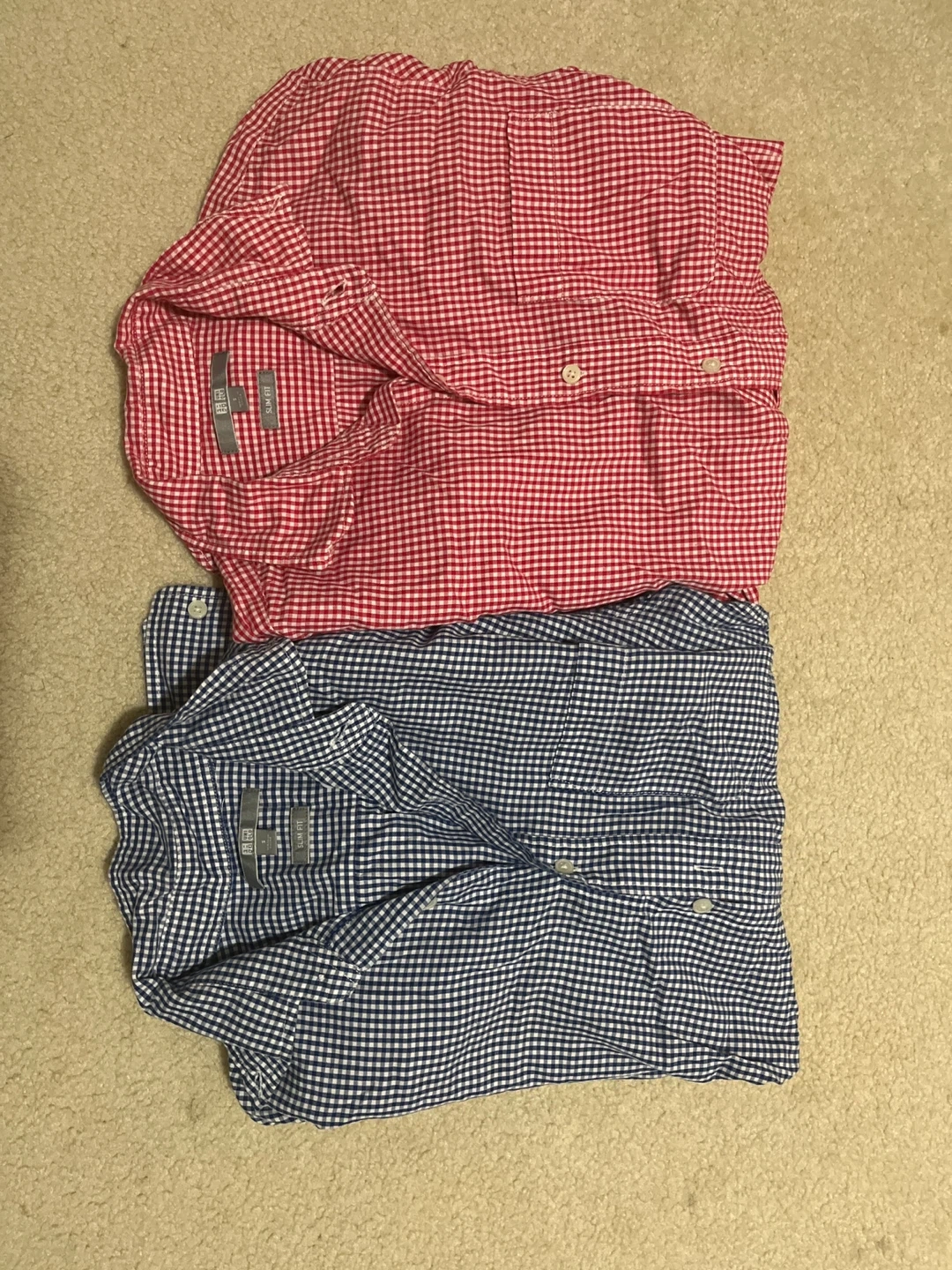 Selling two Uniqlo slim-fit shirts in a classic gingham pattern! One is red and white, and the other is blue and white. Both are in great condition and ready for a new home!