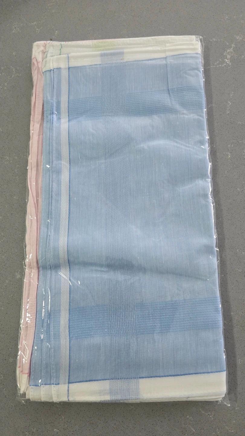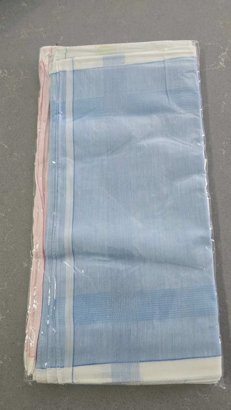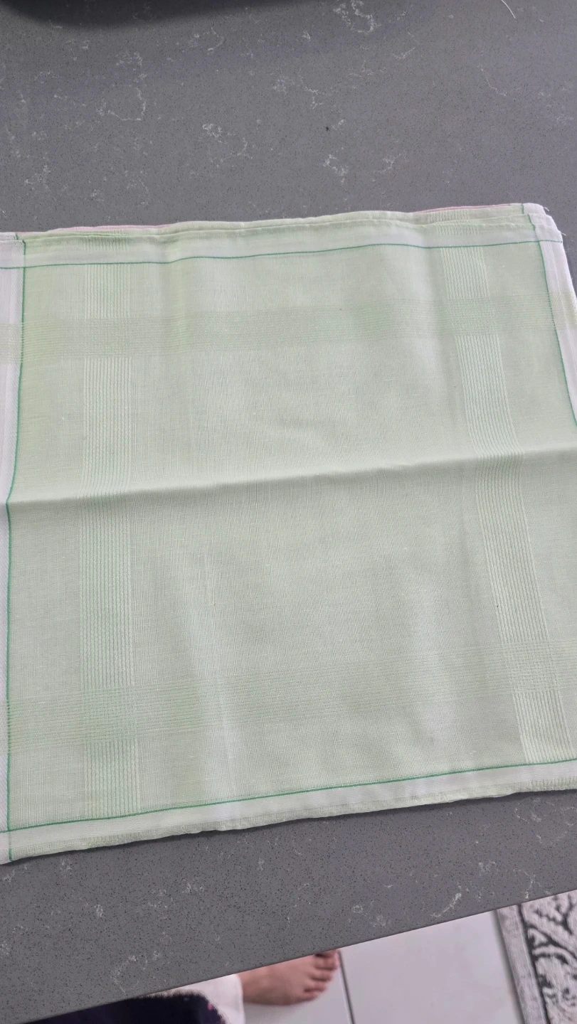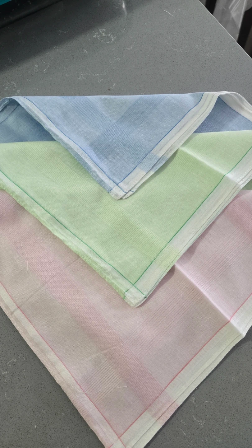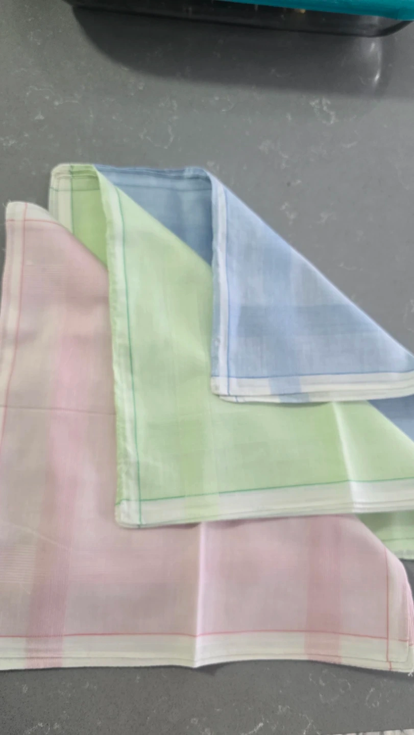 This is a set of dozen handkerchiefs, four in blue, four in green, and four in pink. They're made of a soft cotton fabric with a classic striped pattern. Each handkerchief measures approximately 16x16 inches.Also available in bulk.