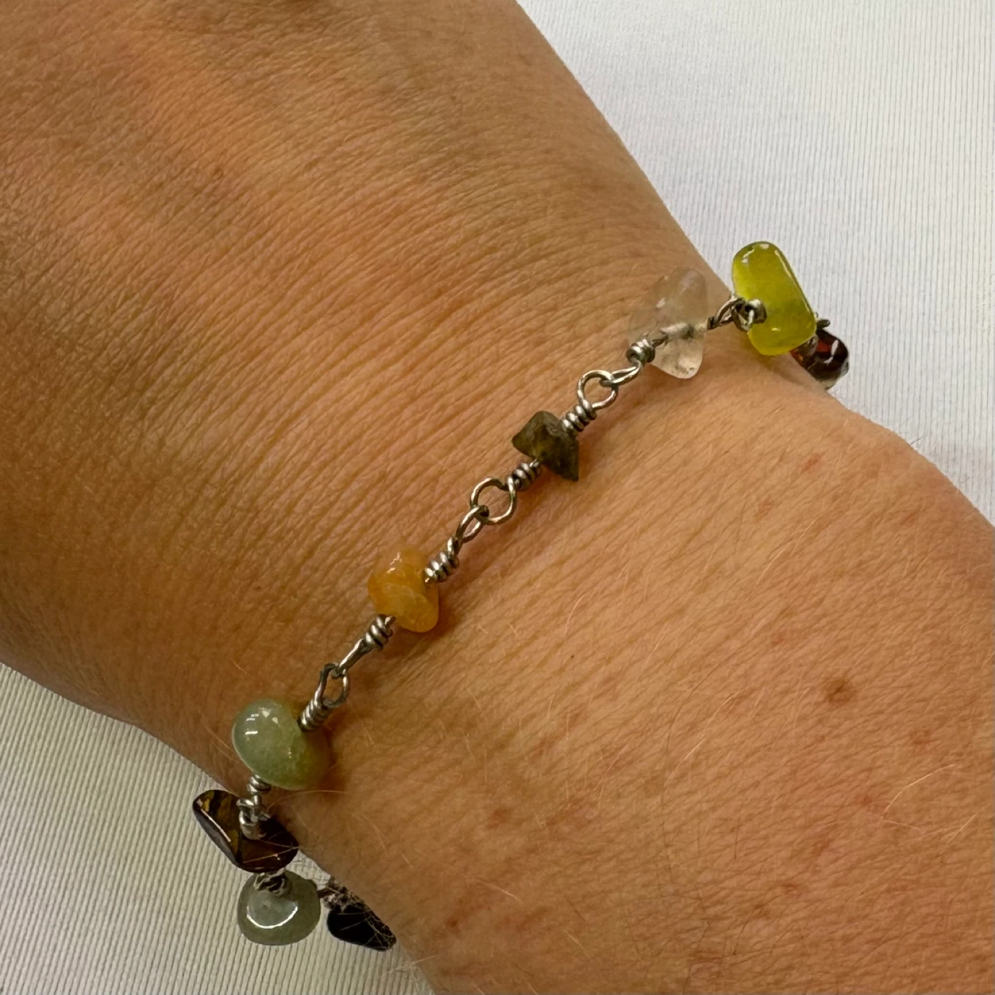 Keywords: handmade, bracelet, wire wrap, semi precious, stone, chip, multi color, silver, jewelry, boho, chic, unique, natural