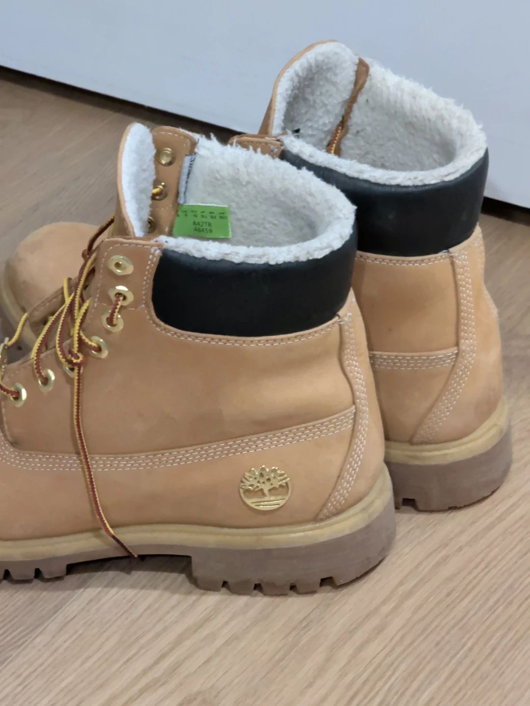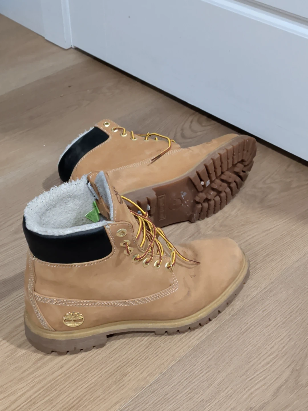 These Timberland boots feature a classic tan nubuck leather exterior with a cozy shearling lining. They have a durable rubber sole and yellow and red striped laces. These boots are built for warmth and comfort!