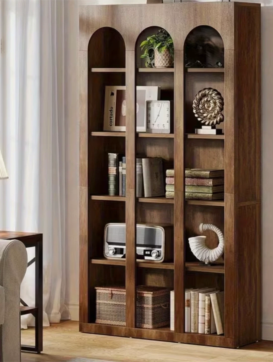 This tall bookshelf features three arched sections, providing ample display and storage space. It's constructed from durable wood with a warm finish. The overall dimensions are 70.86 inches high and 39.37 inches wide.