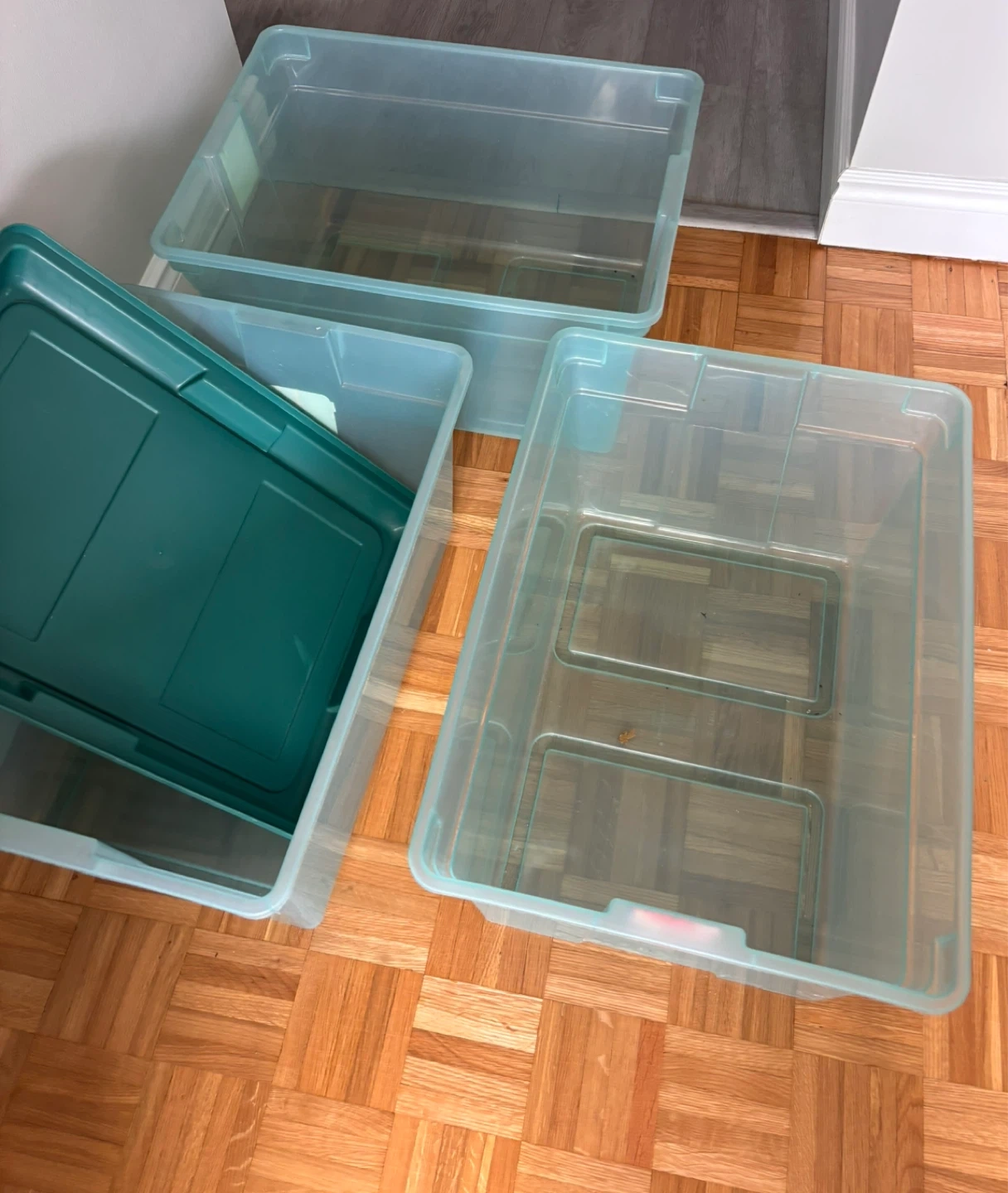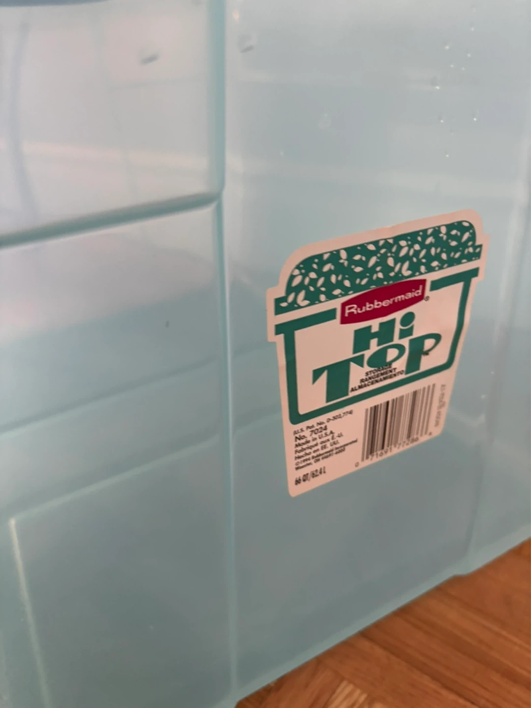 Set of 3 clear blue Rubbermaid Hi-Top storage totes with lids