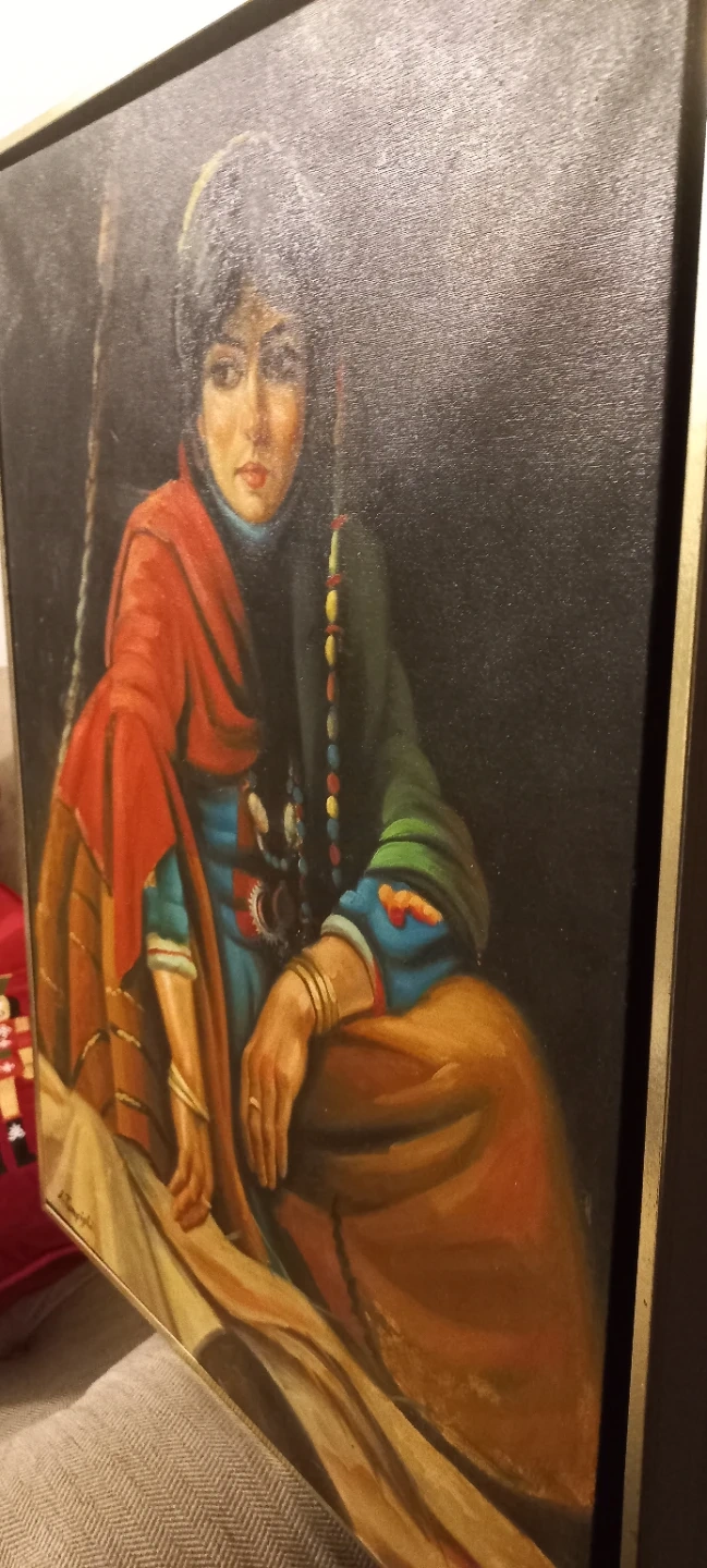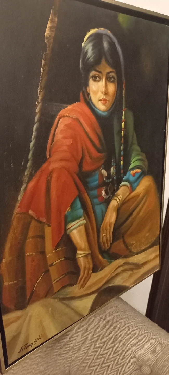 Very beautiful framed painting depicting a woman in traditional attire. Signed by the artist. Adds a unique touch to any decor.