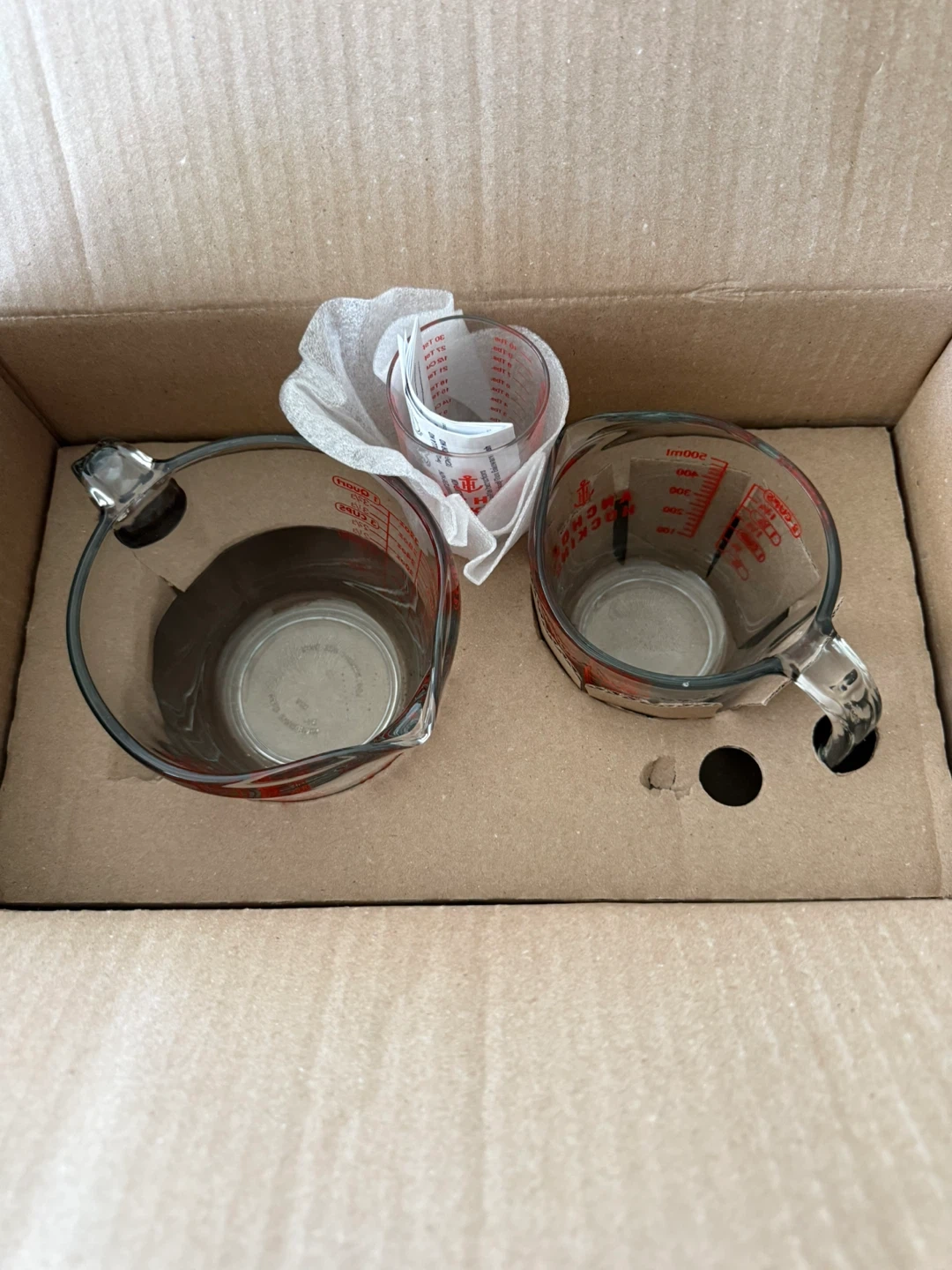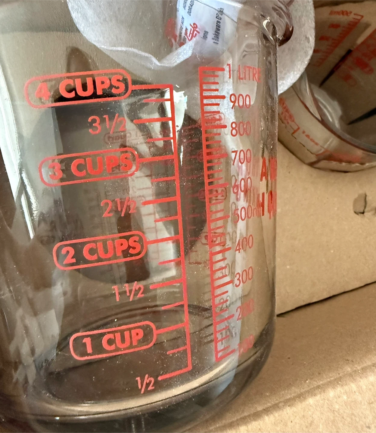 This set includes two glass measuring cups with red markings for both imperial and metric measurements. One cup measures up to 4 cups or 1 litre, while the other measures up to 2 cups or 500ml. They're useful for accurate ingredient measuring in the kitchen!