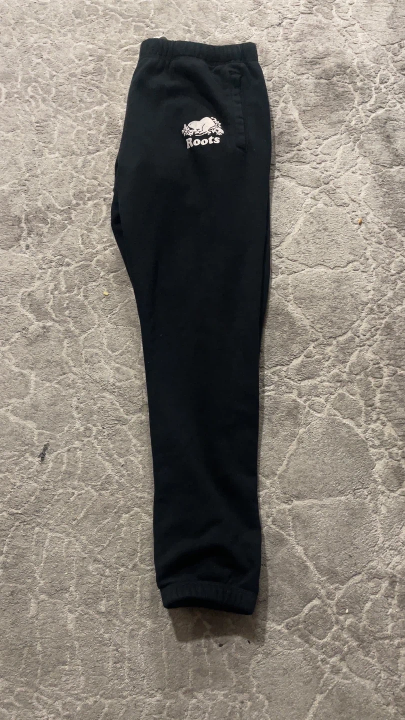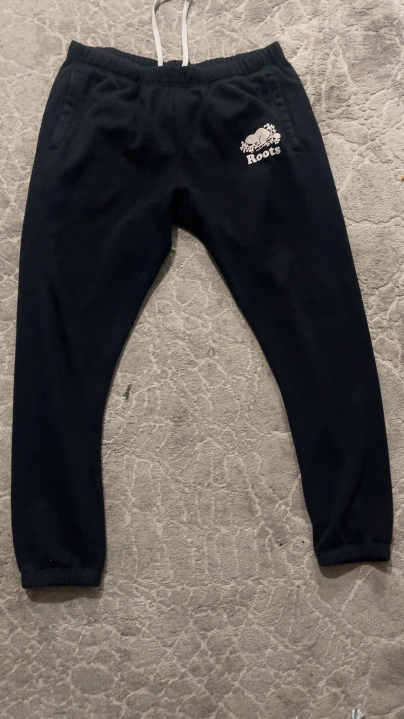 These black Roots sweatpants are a size medium. They are made from 80% organic cotton and 20% recycled polyester blend. These pants are comfy for lounging!