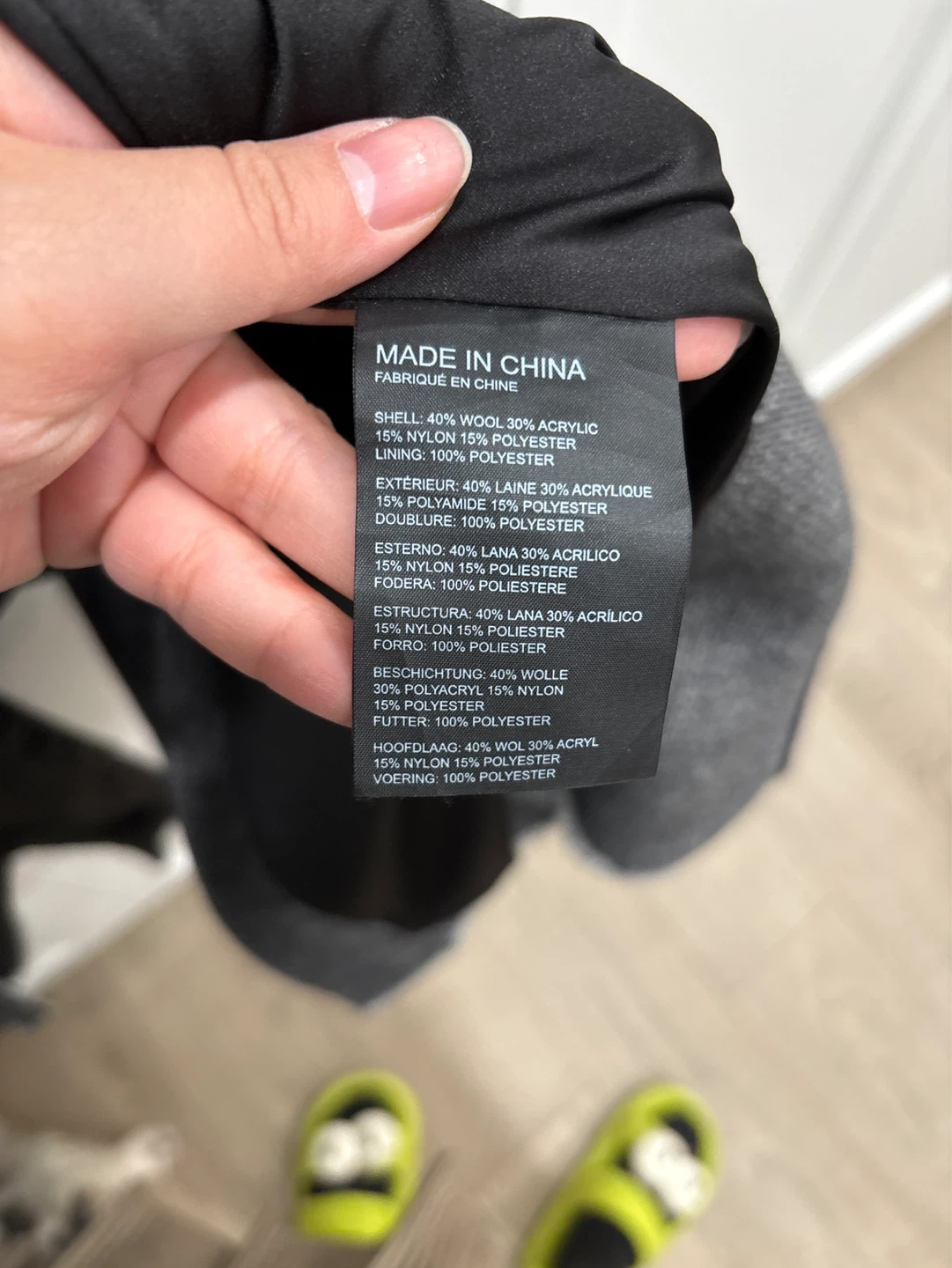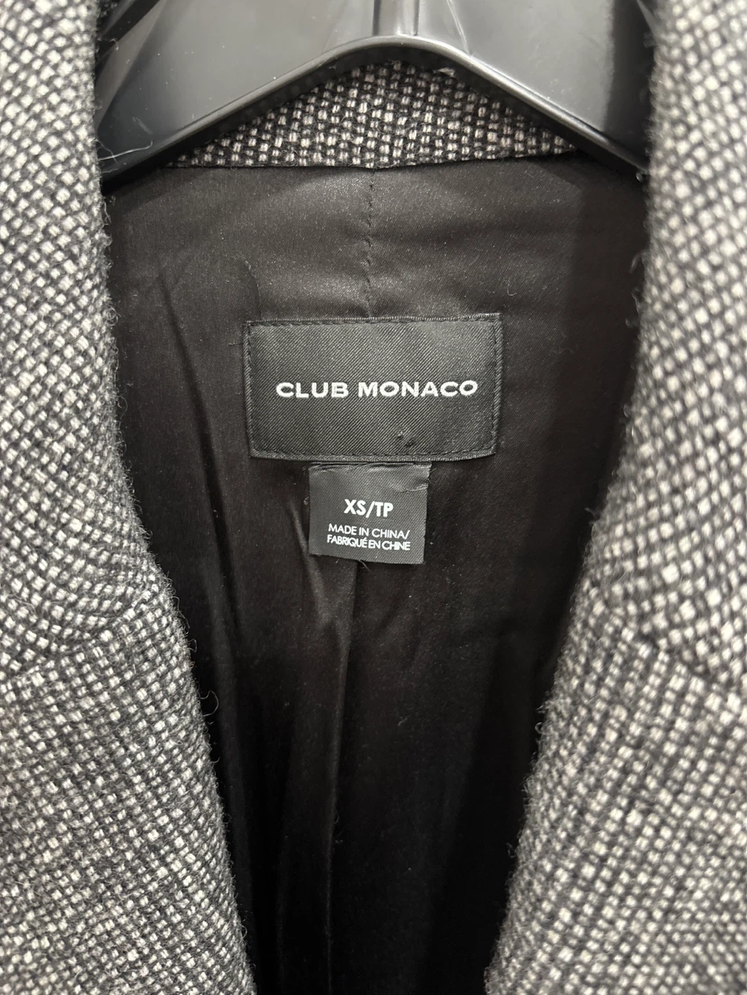 A stylish Club Monaco coat made from a wool-blend fabric. Shell: 40% wool, 30% acrylic, 15% nylon, 15% polyester. Lining: 100% polyester. Perfect for cooler weather!