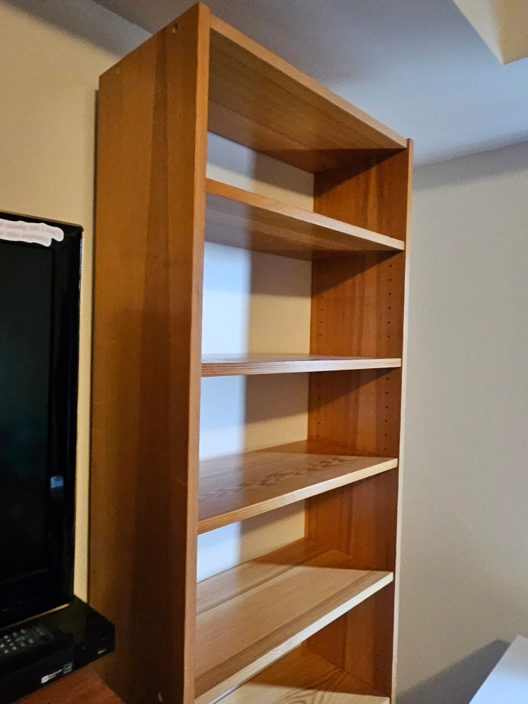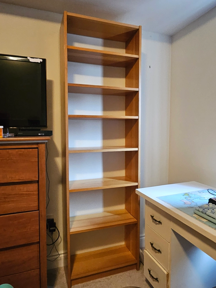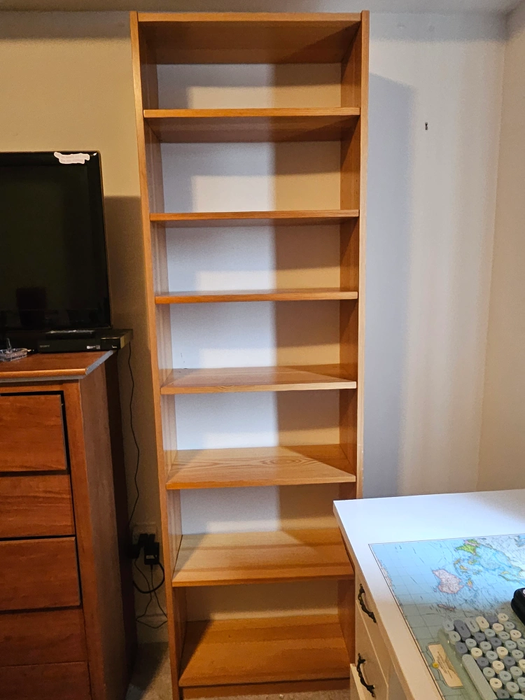 Tall wooden bookshelf with six shelves.
