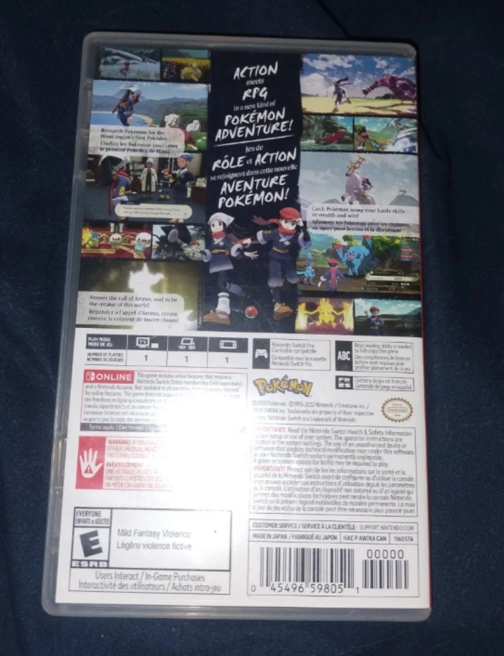 Pokemon Legends Arceus for the Nintendo Switch. This game offers an action RPG experience in the Sinnoh region. It includes the game cartridge and original case