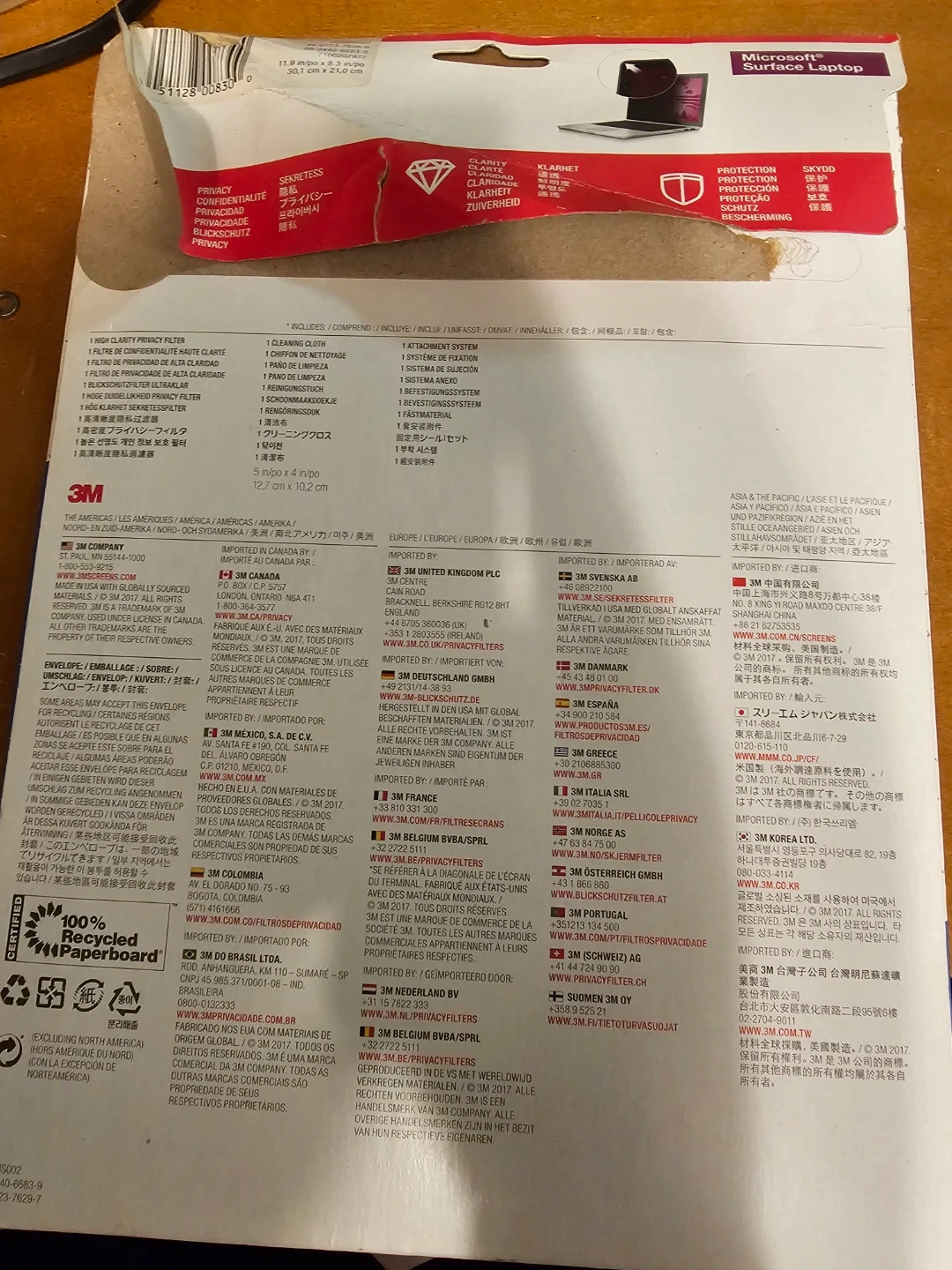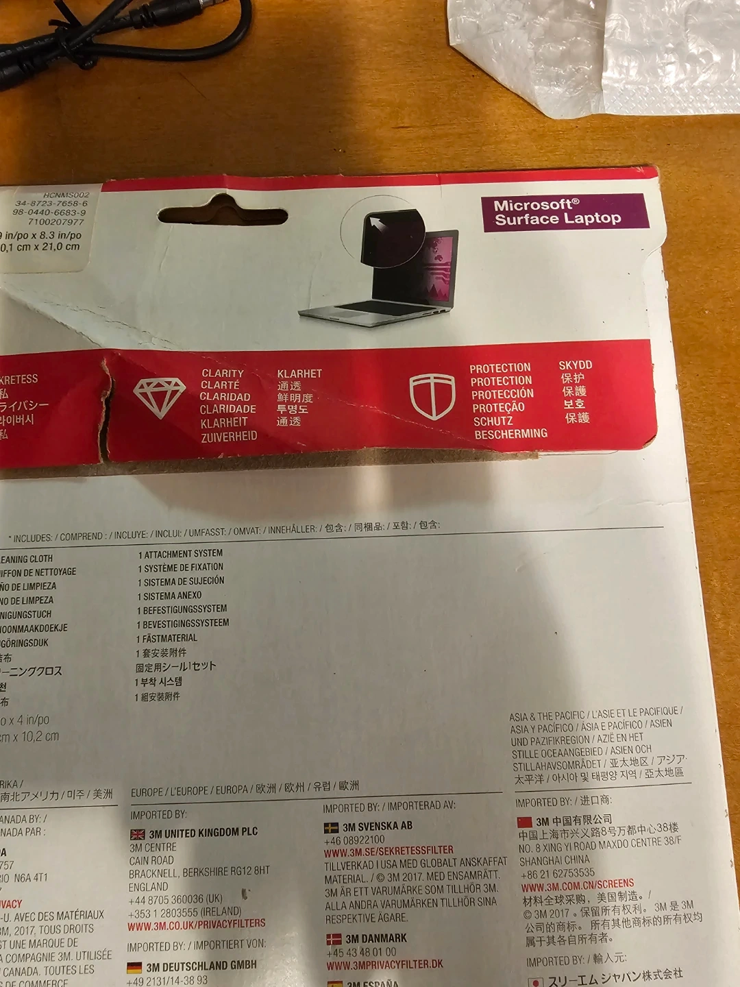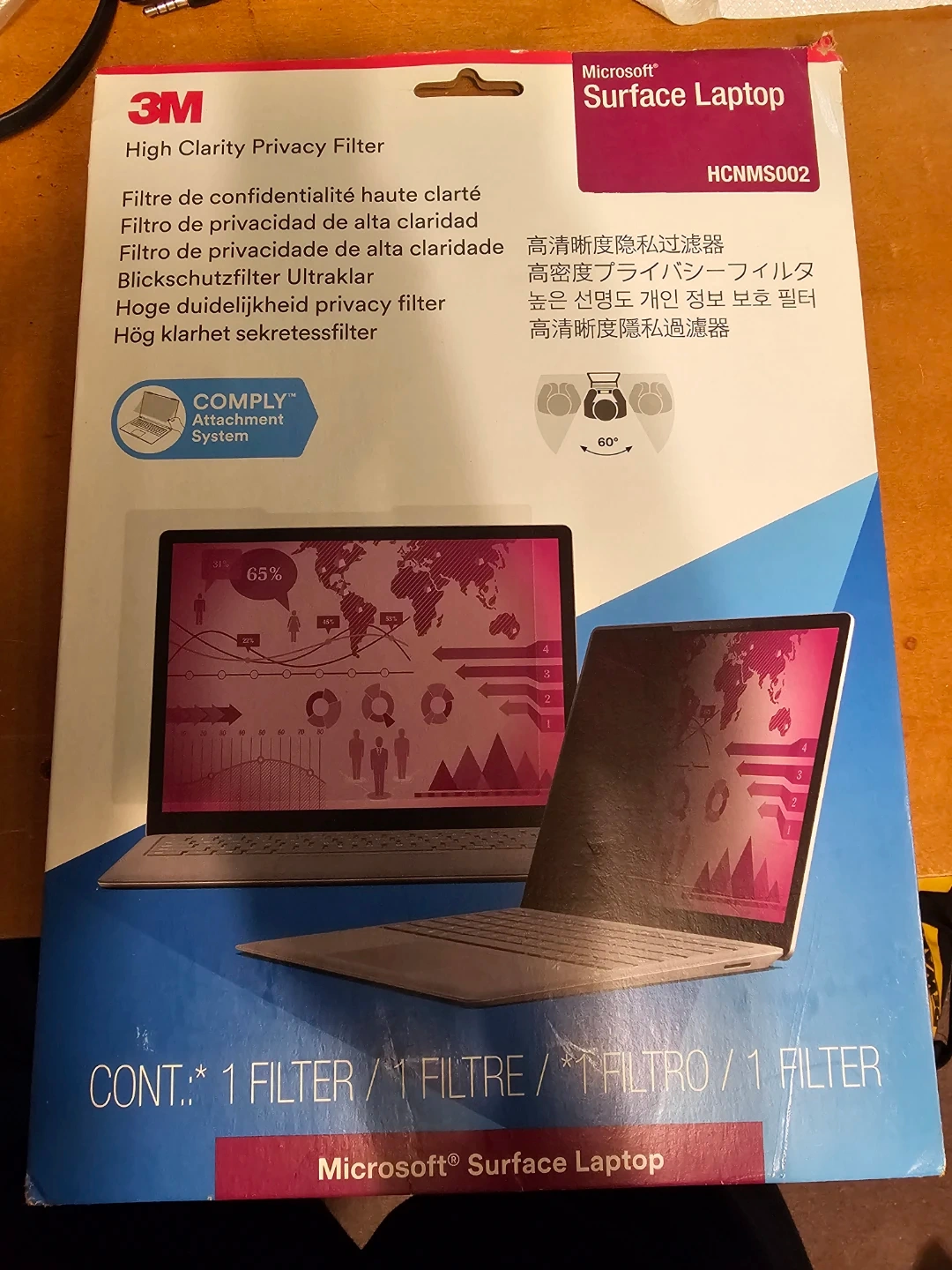 Selling a 3M High Clarity Privacy Filter for a Microsoft Surface Laptop! It comes with a cleaning cloth and attachment system. The filter size is 5 in/po x 4 in/po (12.7 cm x 10.2 cm).