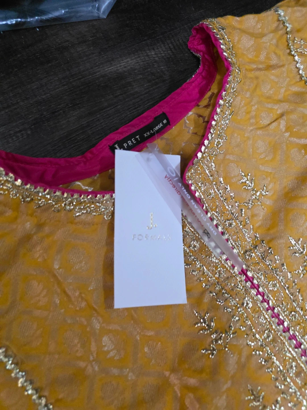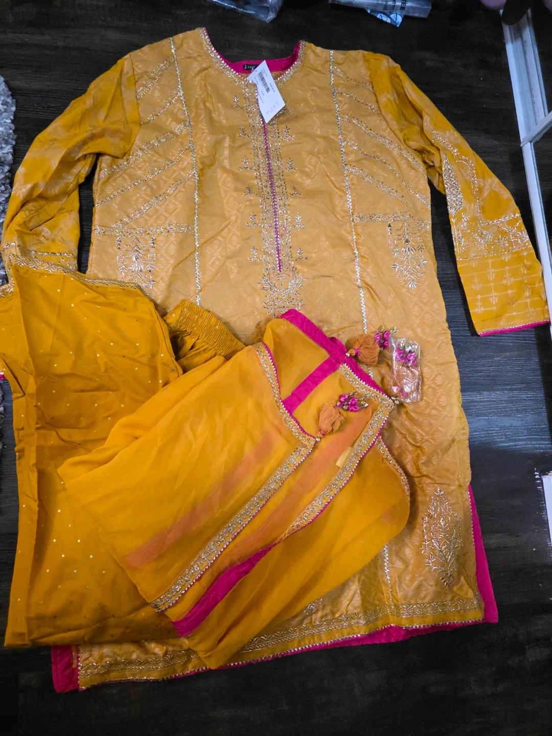 Yellow kurti with intricate gold embroidery and hot pink trim. Includes matching dupatta with shalwar with similar embellishments. Size XX-Large. This outfit is perfect for cultural events or festive occasions.