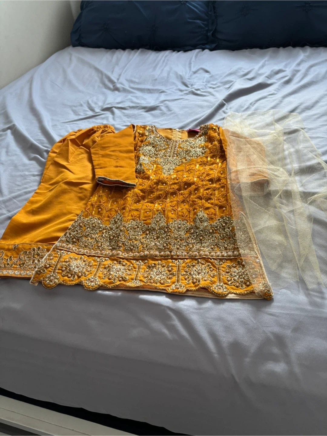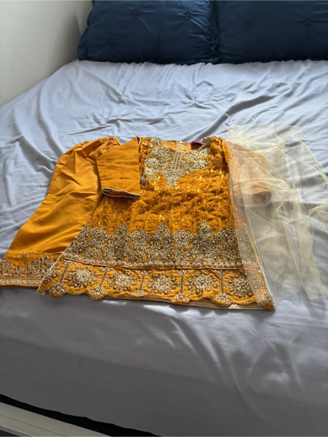 This is a beautiful yellow embroidered kurti with matching pants and a sheer dupatta. The kurti features intricate gold embellishments along the neckline and hem. Perfect for kids for festive occasions or cultural events!