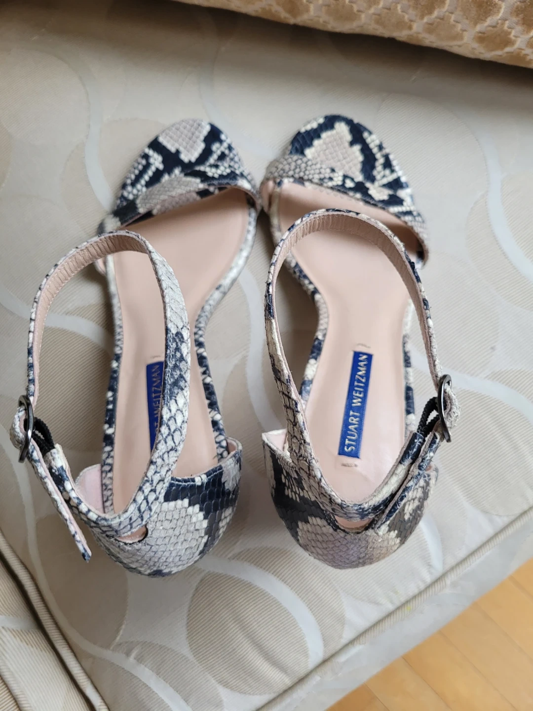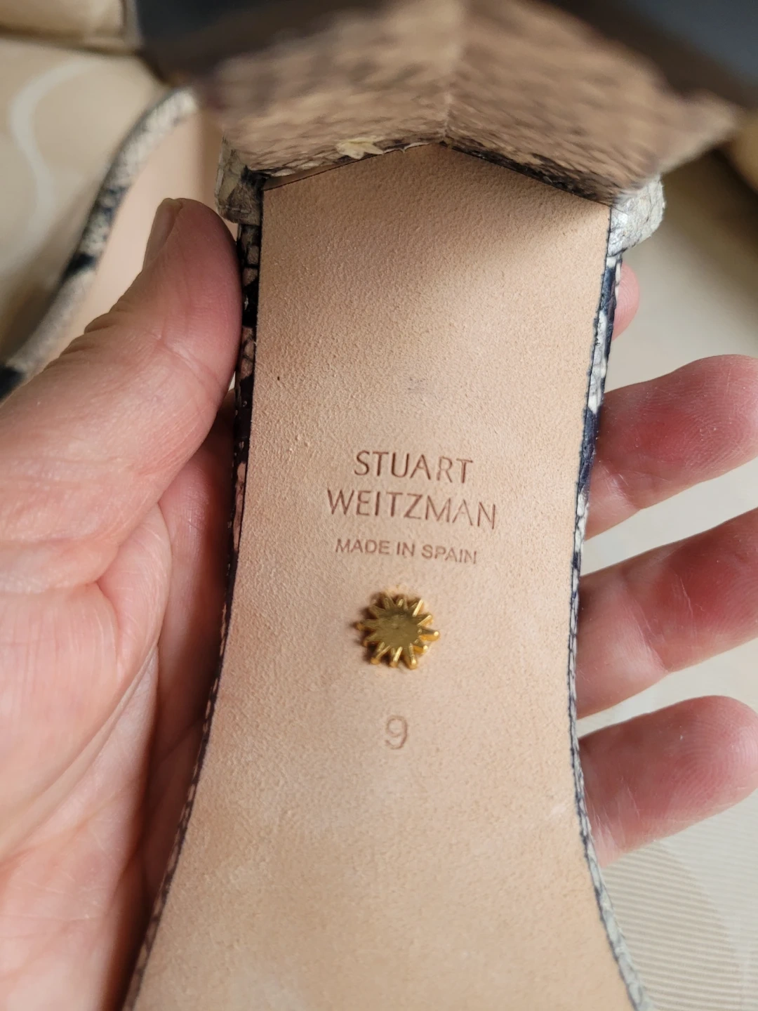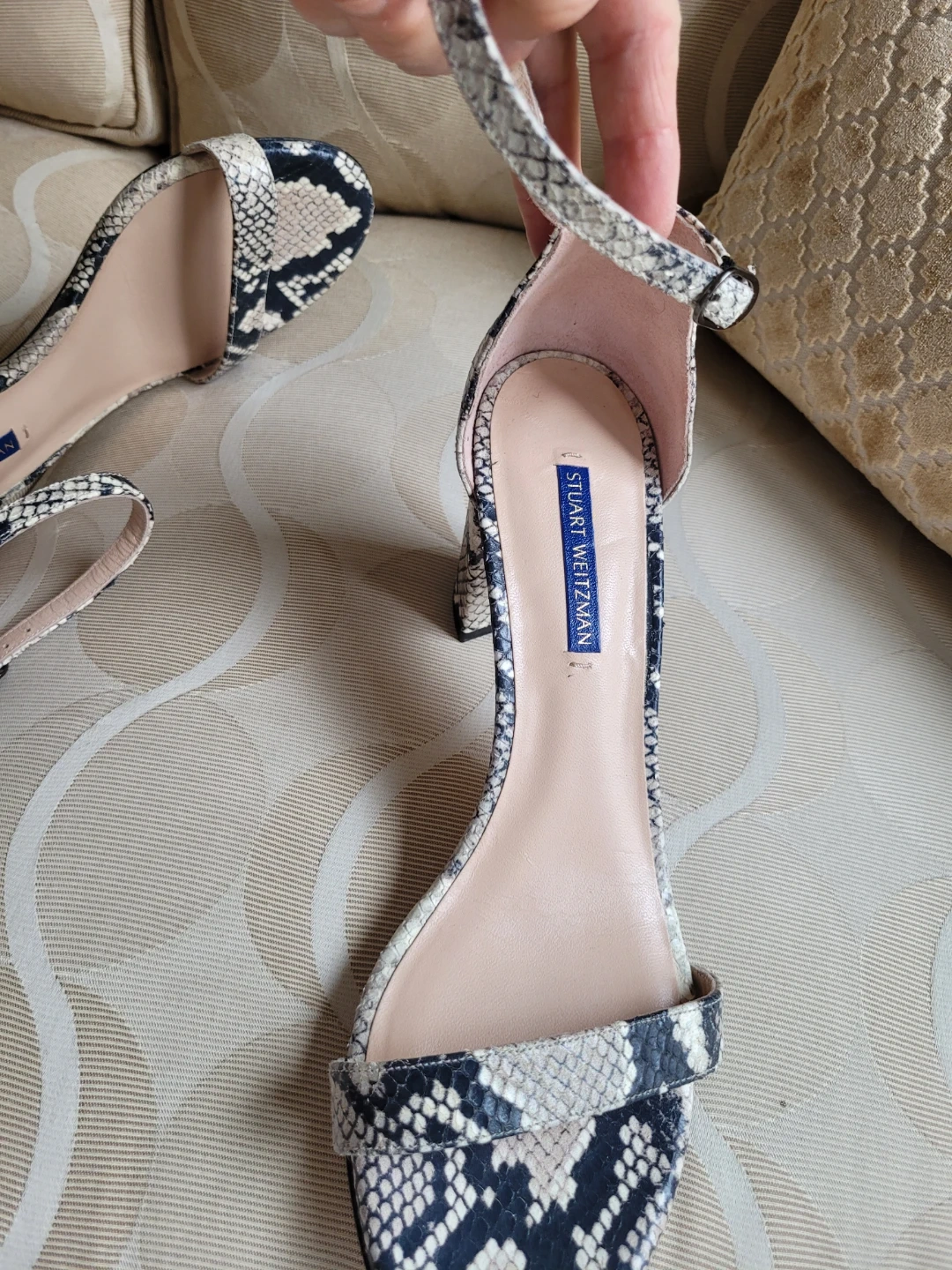 Practically New Stuart Weitzman sandals featuring a stylish snakeskin pattern and comfortable 3.3' block heel. These open-toe heels have an adjustable thin ankle strap for a secure fit and padded footbed. Sz 9 worn once.
