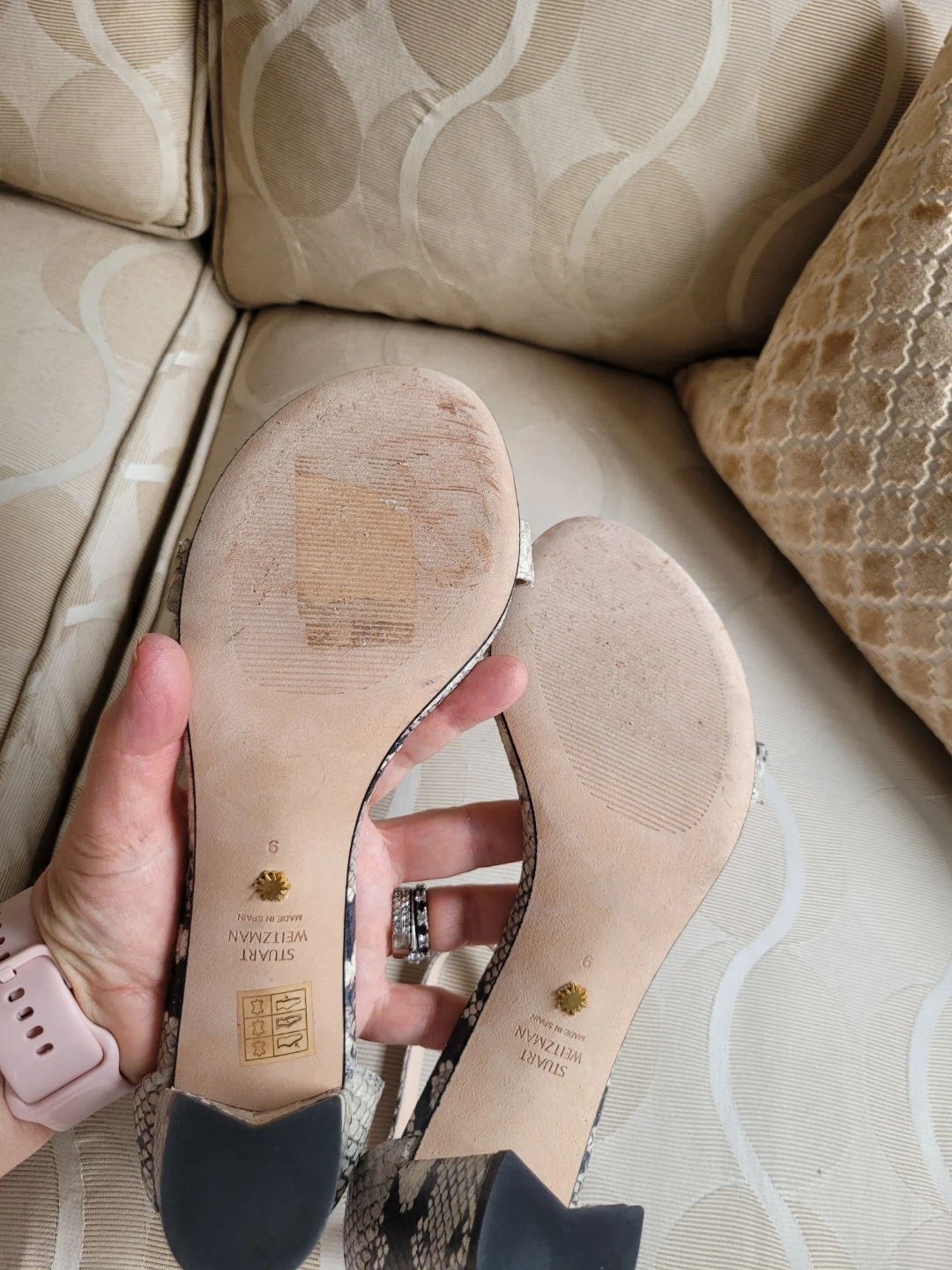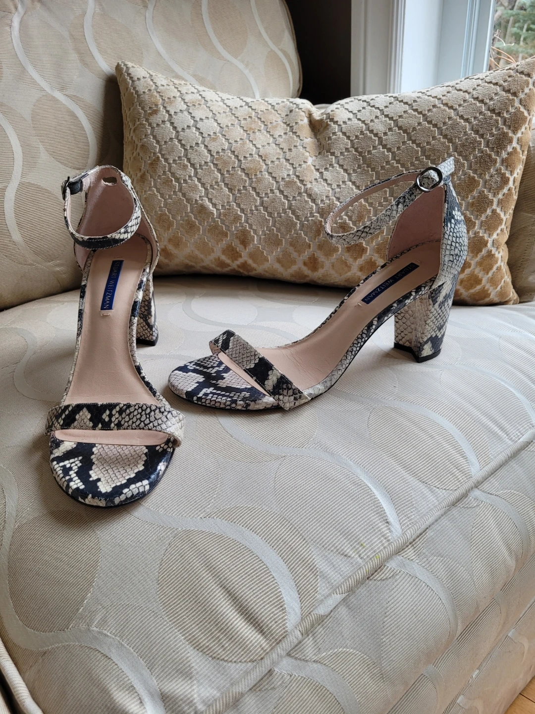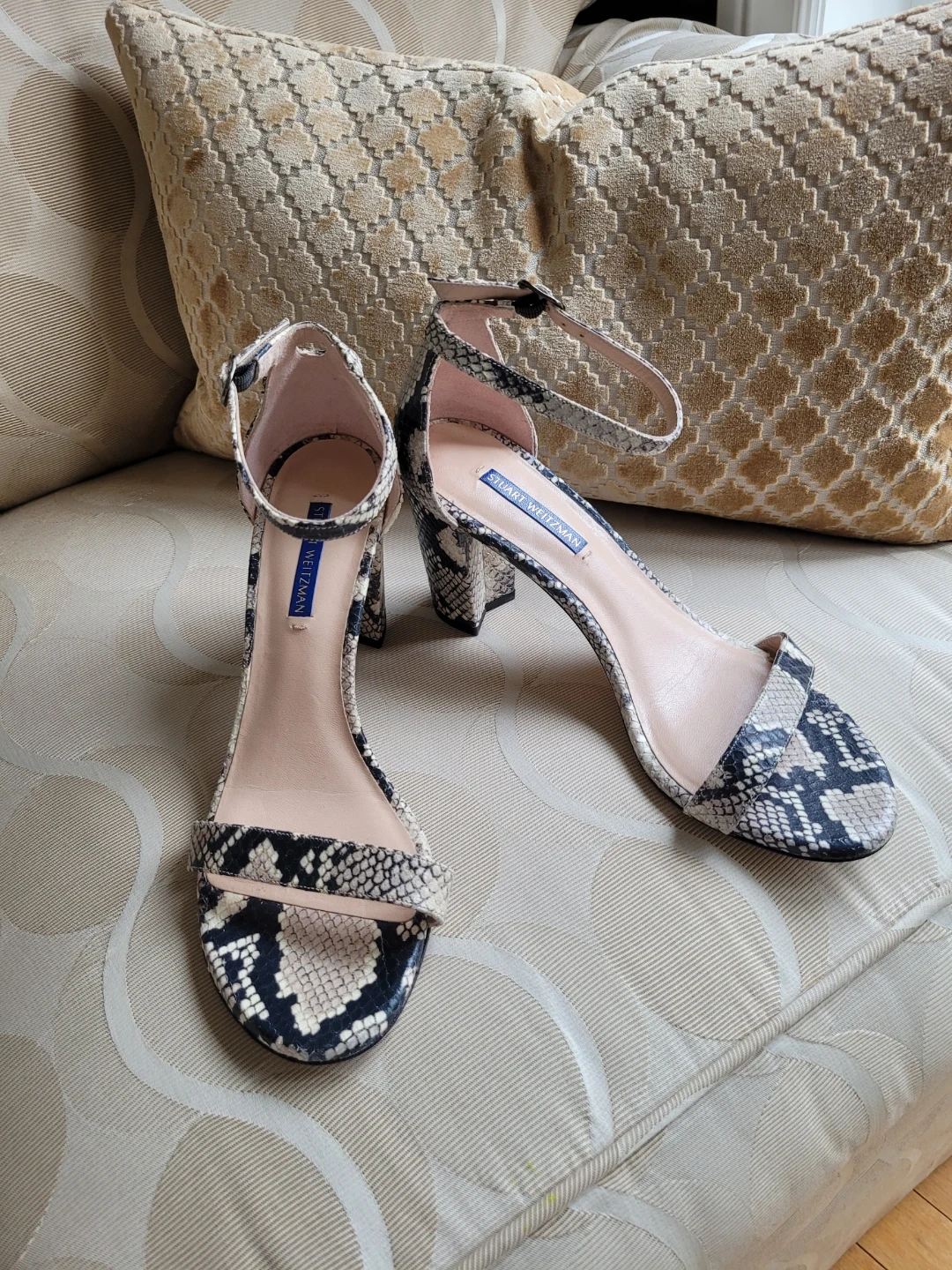 Practically New Stuart Weitzman sandals featuring a stylish snakeskin pattern and comfortable 3.3' block heel. These open-toe heels have an adjustable thin ankle strap for a secure fit and padded footbed. Sz 9 worn once.