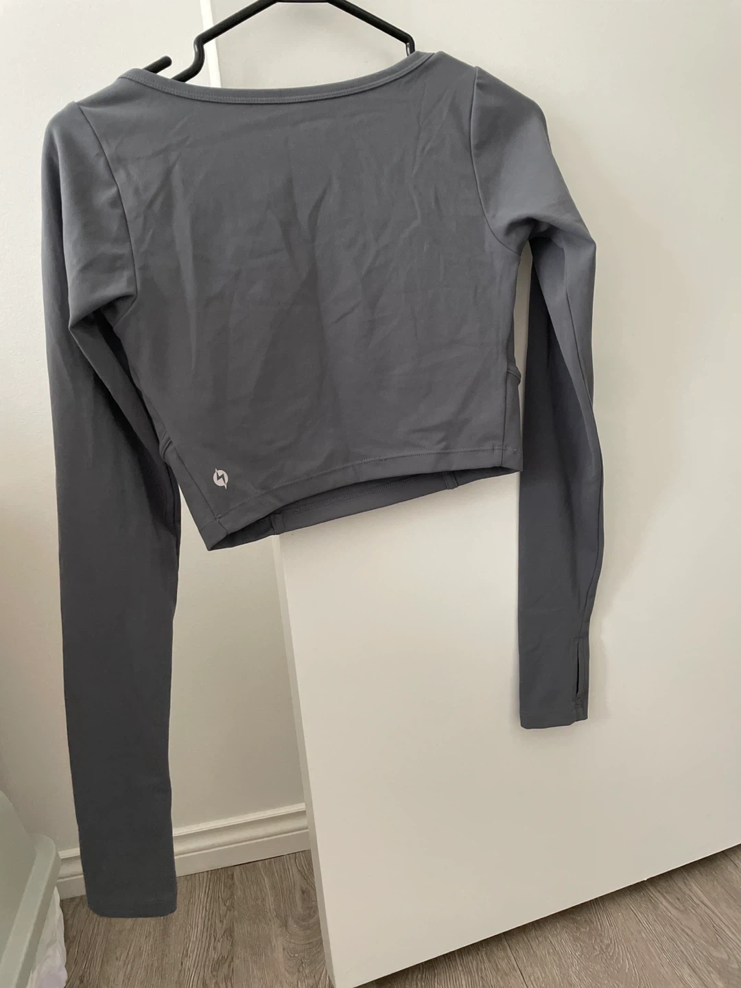 POPFLEX long sleeve cropped top in a medium size. This top is made from a blend of polyester and spandex. Features a stylish square neckline and thumbholes.