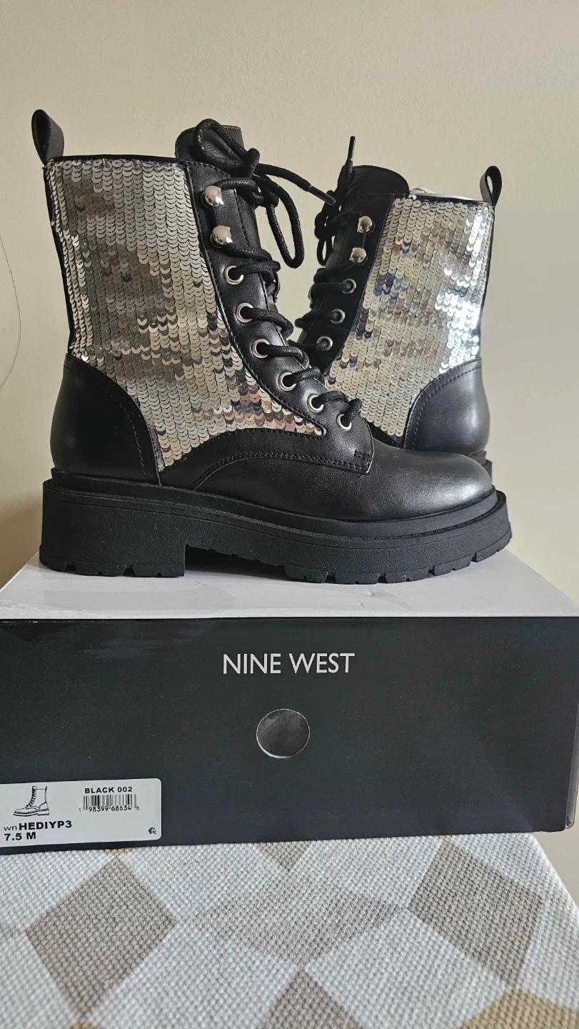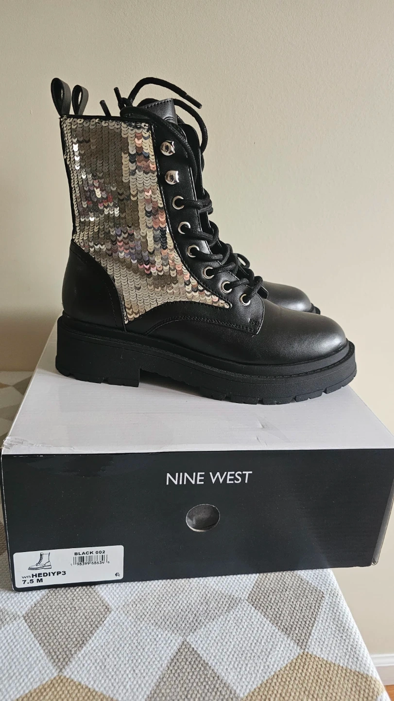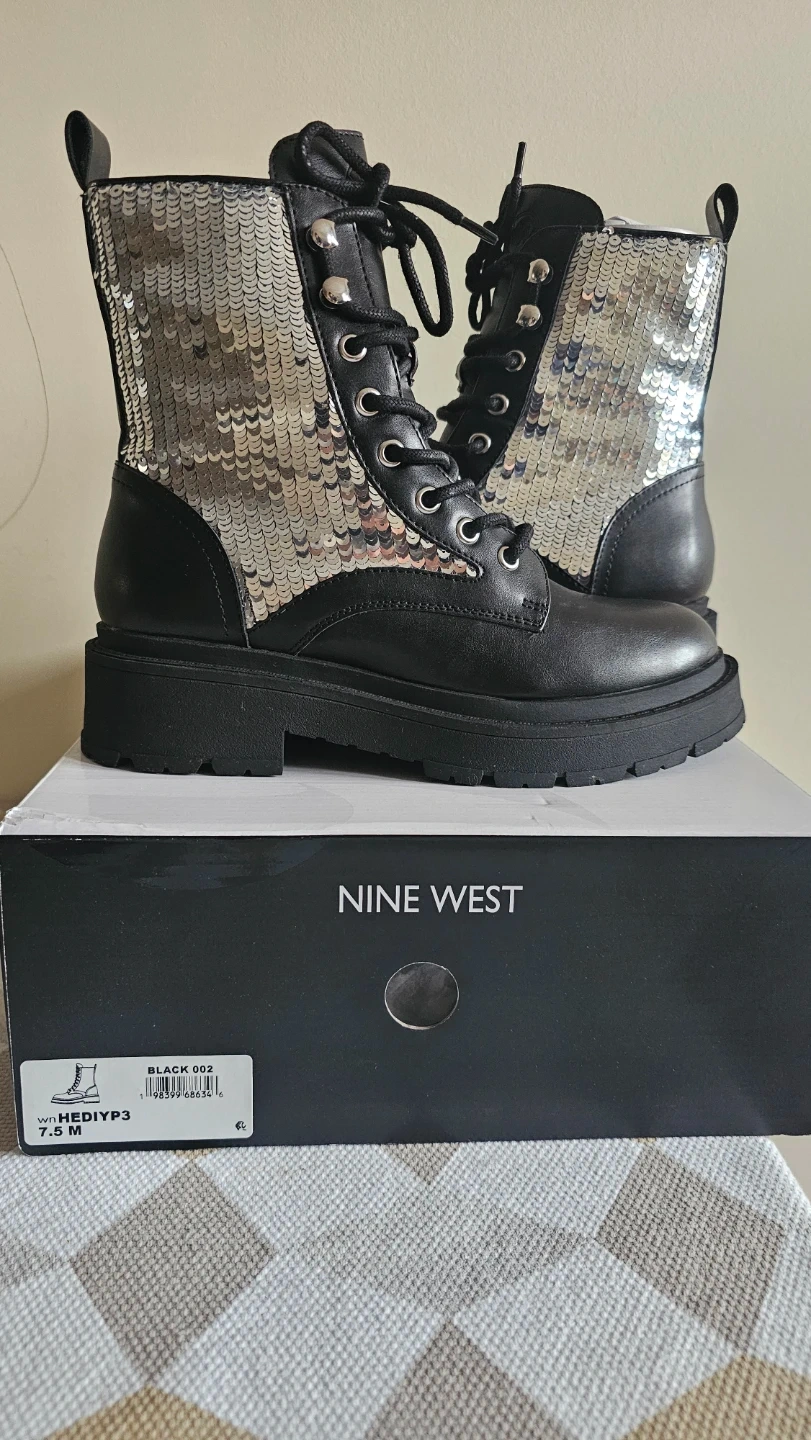 These Nine West combat boots feature black faux leather with eye-catching silver sequin detailing on the shaft. They have a lace-up front and a lug sole for a classic combat boot look. Includes original box. Size is 7.5 M.