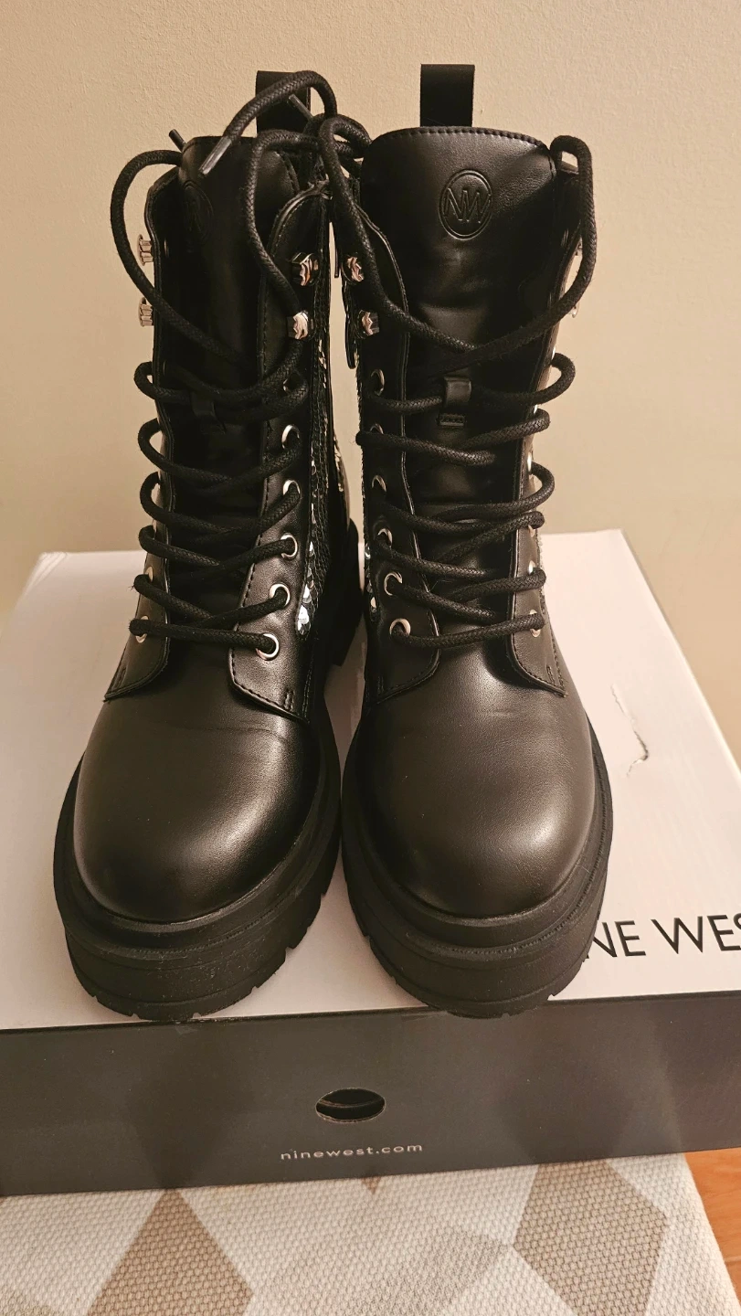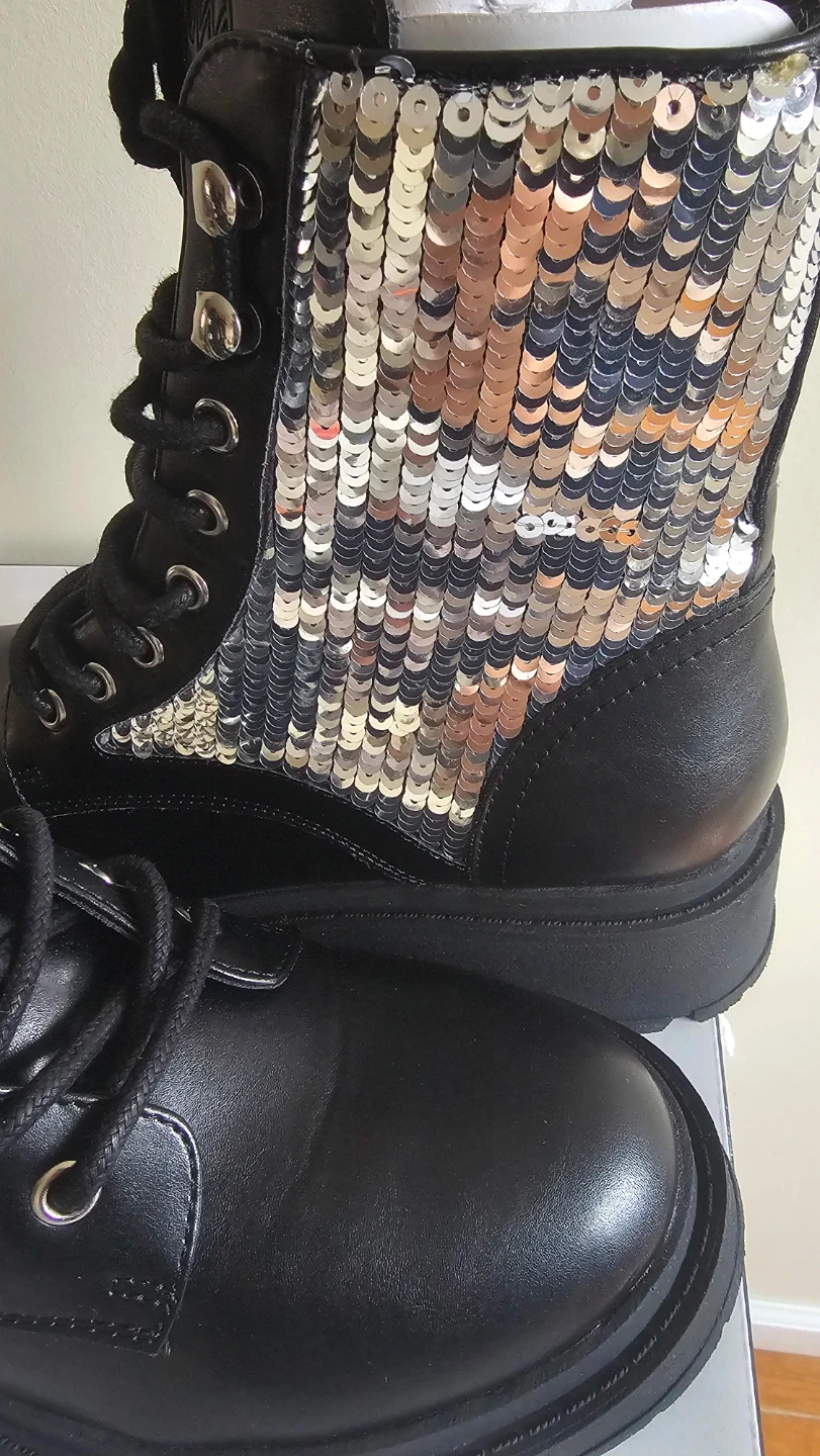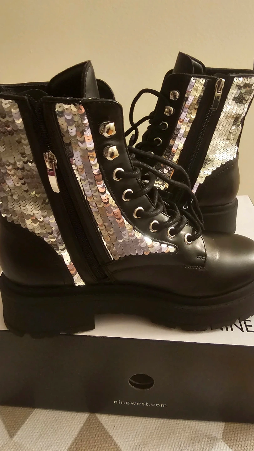 These Nine West combat boots feature black faux leather with eye-catching silver sequin detailing on the shaft. They have a lace-up front and a lug sole for a classic combat boot look. Includes original box. Size is 7.5 M.