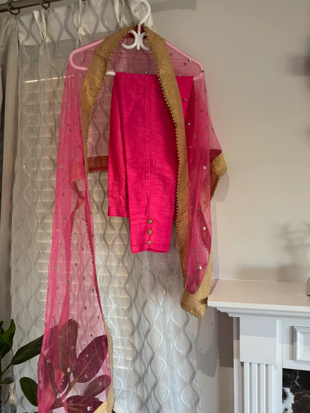 This is a beautiful pink salwar kameez set from Jainco, featuring intricate floral embroidery and sequin embellishments. It includes a matching dupatta and a pink salwar. Perfect for festive occasions or cultural events!