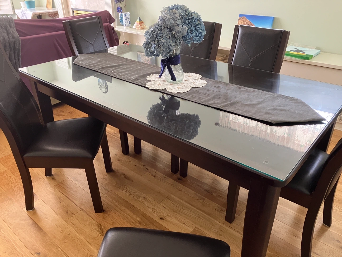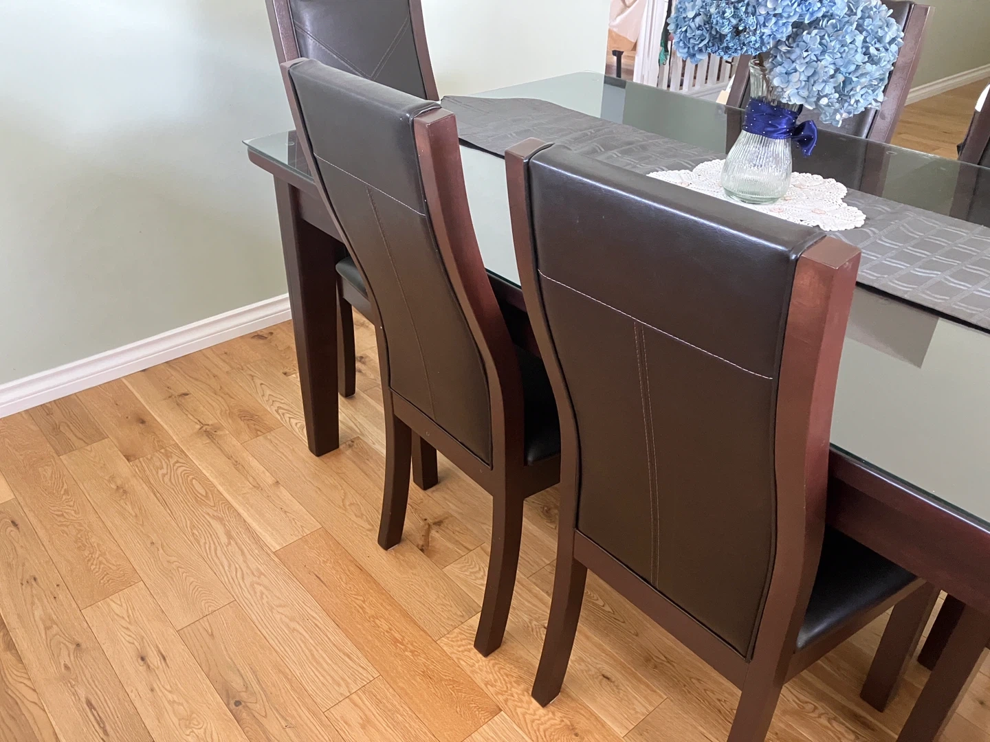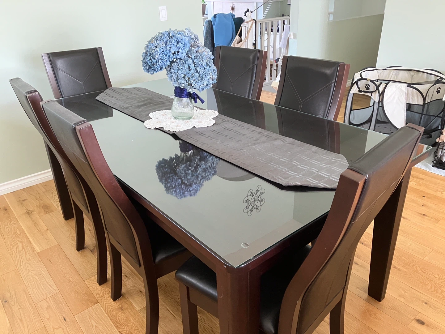 Dark wood dining table with a reflective glass top. Six chairs with dark brown faux leather upholstery are included. The table features a sturdy wooden frame. It's perfect for family dinners!