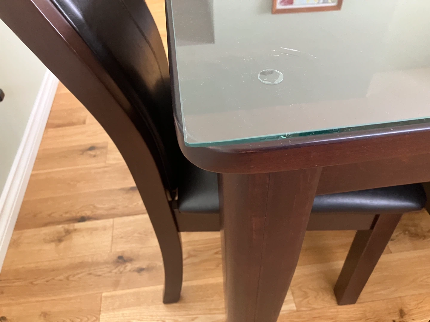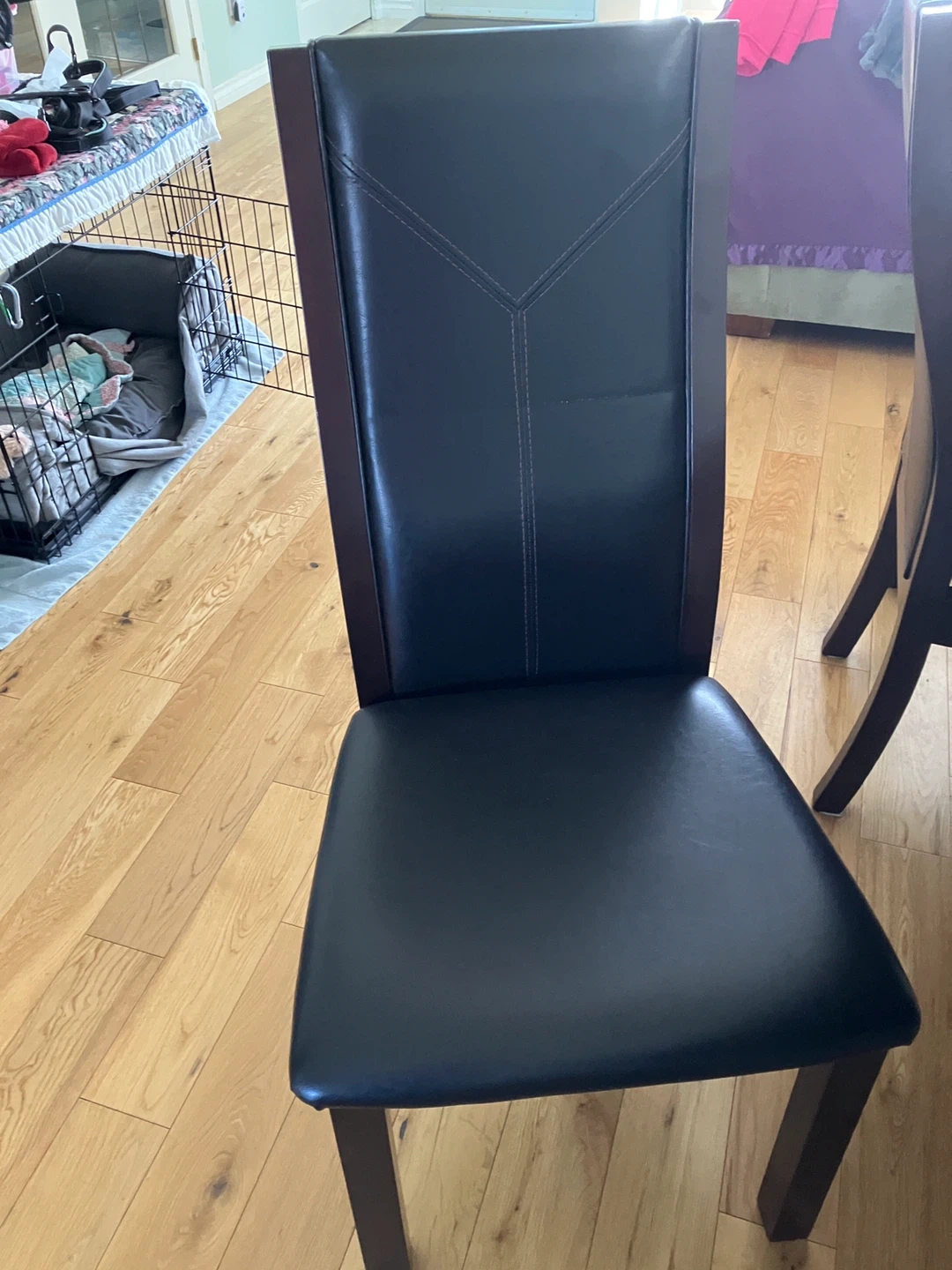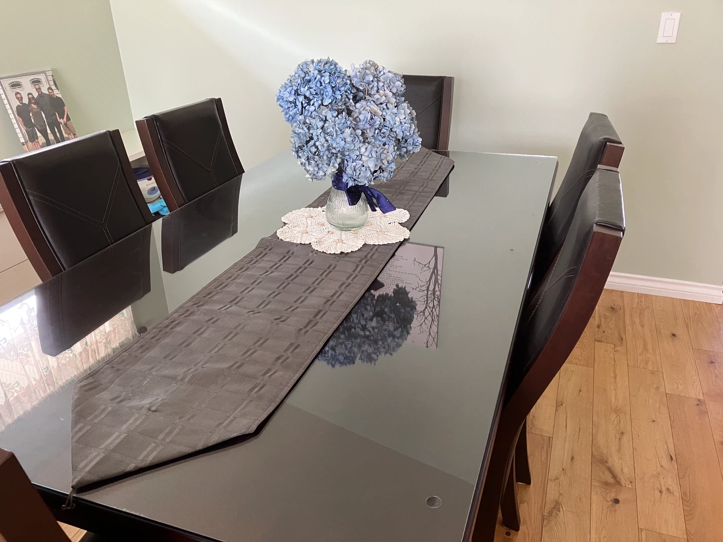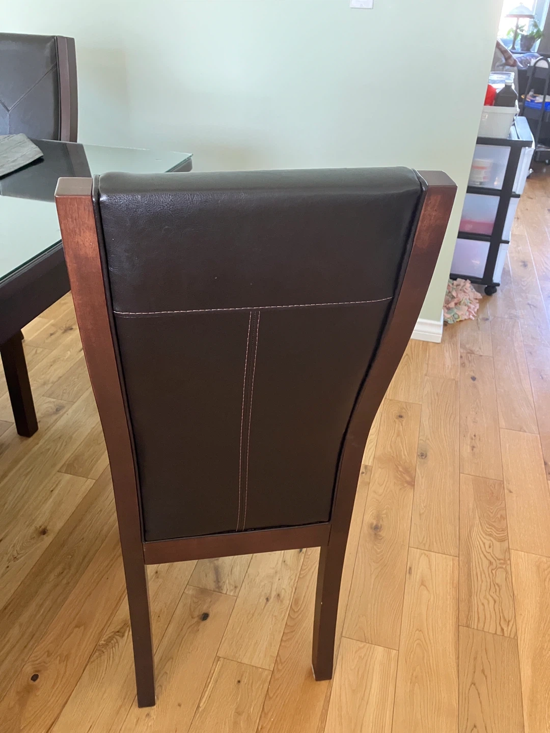 Dark wood dining table with a reflective glass top. Six chairs with dark brown faux leather upholstery are included. The table features a sturdy wooden frame. It's perfect for family dinners!