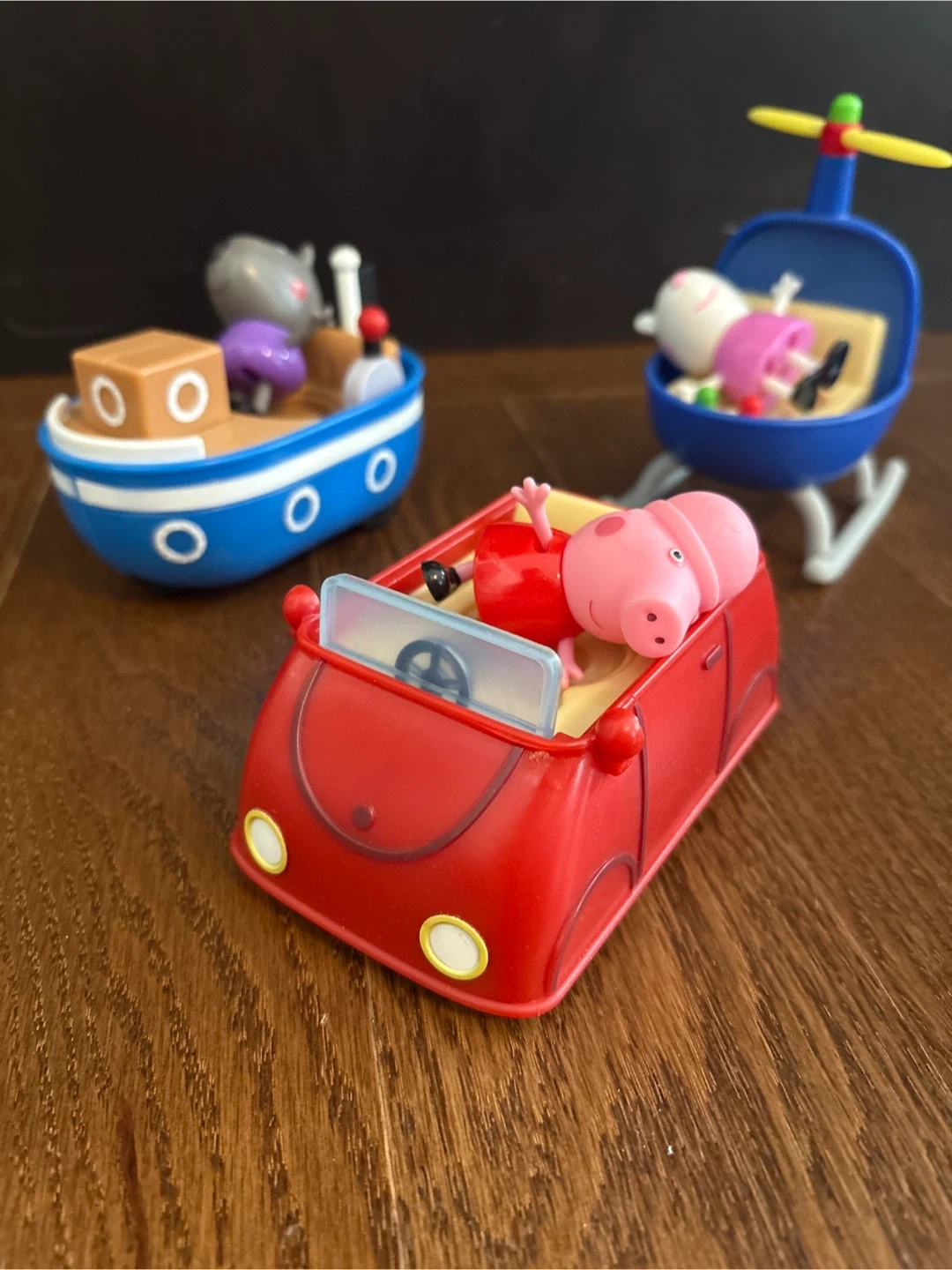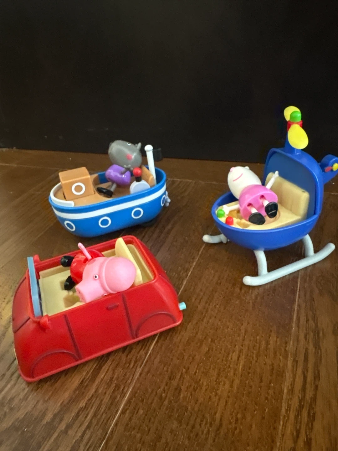 Selling a cute set of Peppa Pig vehicles! Includes a red car, blue helicopter, and blue boat. Great for imaginative play! Never used. Perfect condition