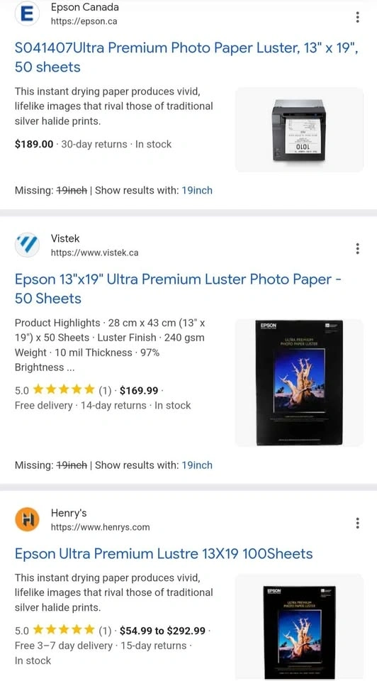 Count of sheets is split between 2 boxes (47+6). Price at the store ~$200+tax. ULTRA PREMIUM PHOTO PAPER LUSTER. With an incredible Dmax and vibrant color gamut, this semi-gloss, photographic paper produces vivid, lifelike images with accurate skin tones and incredible shadow detail. LUSTER 13x19" 329 mm x 483 mm 10 mil 240 g/m². ~52 Sheets.