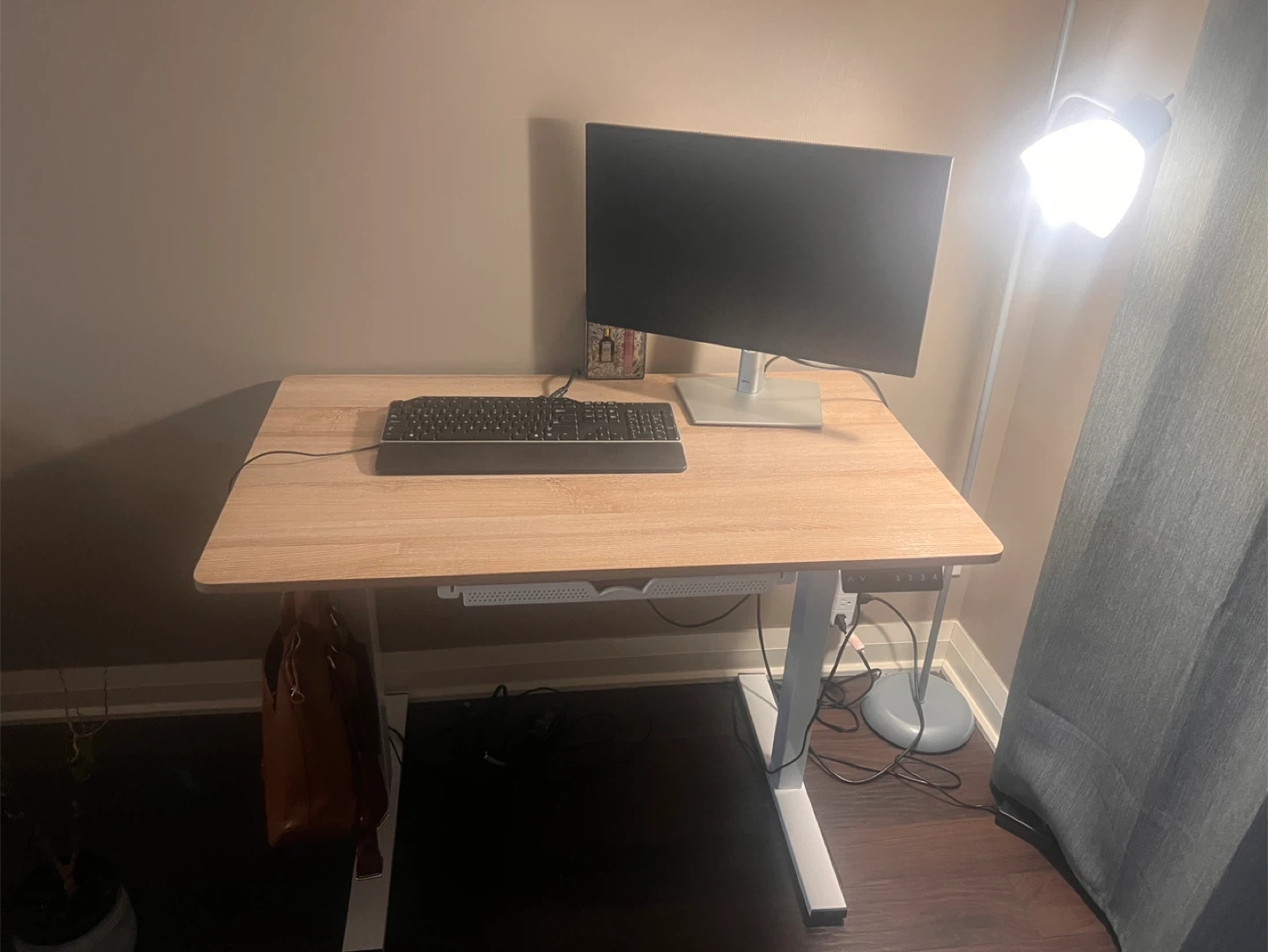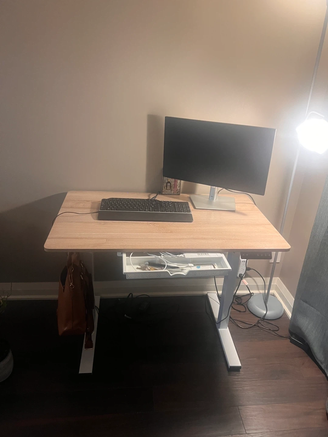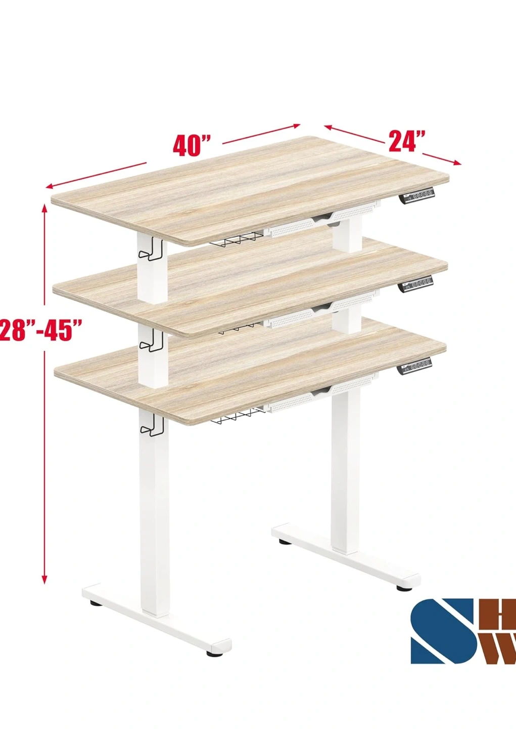 Versatile electric standing desk. Has a light wood top and white frame. Desktop is 40 inches by 24 inches. Height adjusts from 28 to 45 inches. Comes with a convenient under-desk drawer for storage. Control panel has memory presets for easy height changes.
