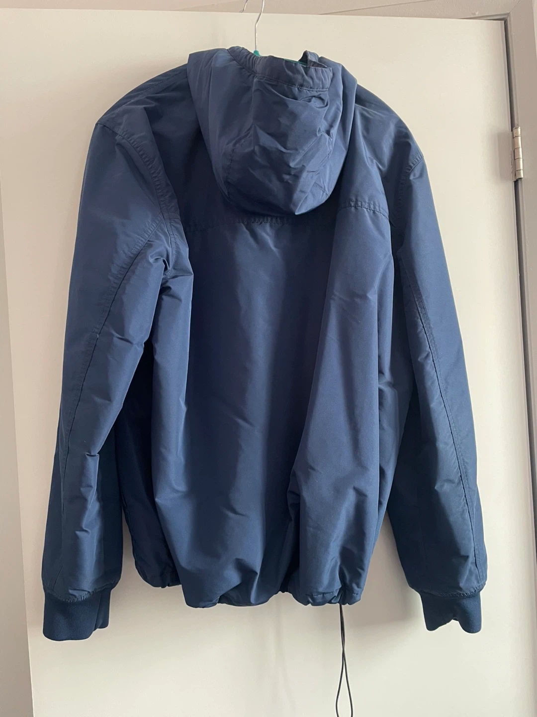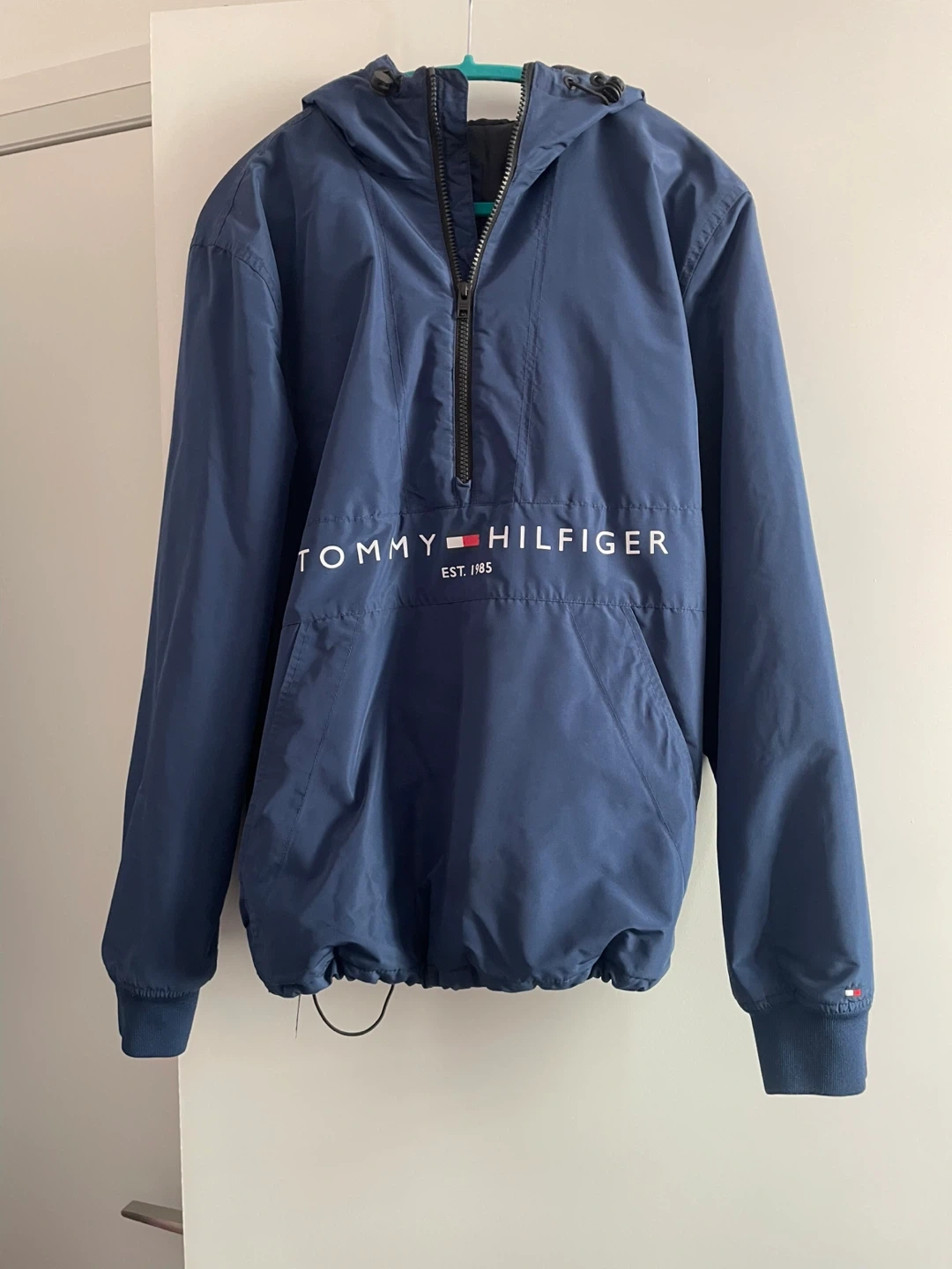 This is a navy blue Tommy Hilfiger anorak jacket with a half-zip closure and a hood. It features the brand's logo across the chest. It's a pullover style with elasticated cuffs and hem. 2 pockets. BRAND new.