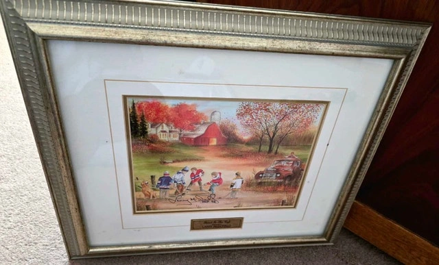 A nostalgic, high-quality print titled "Road To The Cup," depicting a classic autumn scene of children playing pond hockey in front of a red barn and vintage truck. Hand-signed by Hockey Hall of Fame legend Lanny McDonald in black ink, including his "HOF 92" induction year notation. Professionally double-matted in a premium silver-tone ornate frame with a gold-tone title plaque that reads "Road To The Cup - Autographed by LANNY MCDONALD". Excellent condition. The frame is sturdy, and the print and signature are well-preserved behind glass.