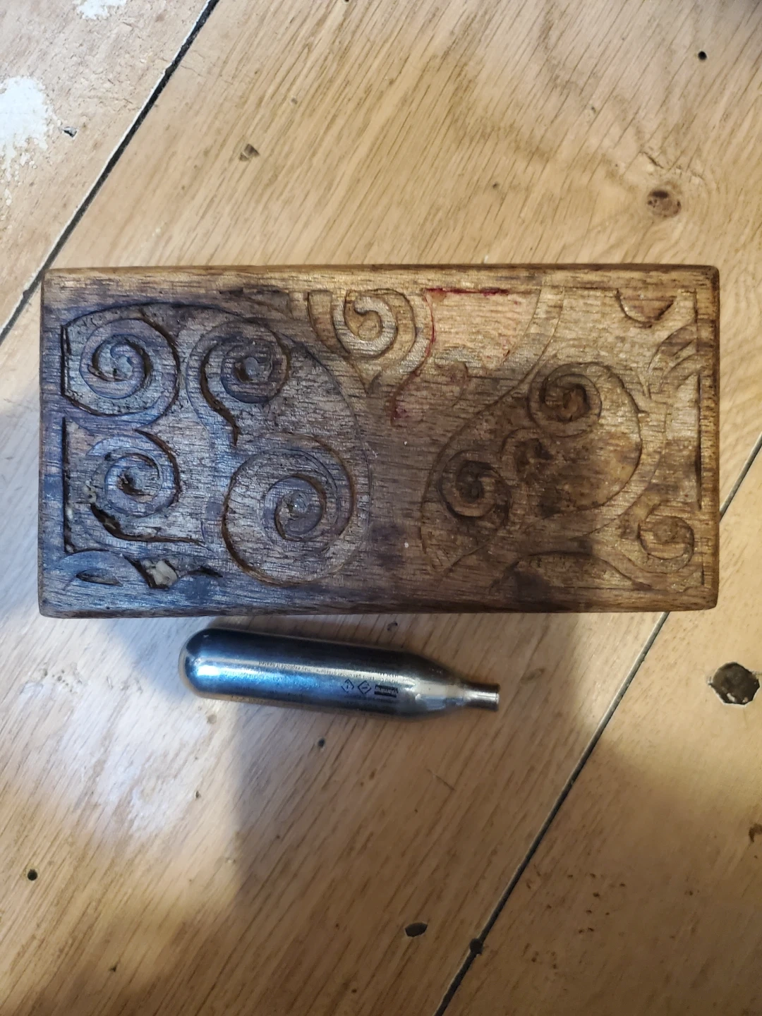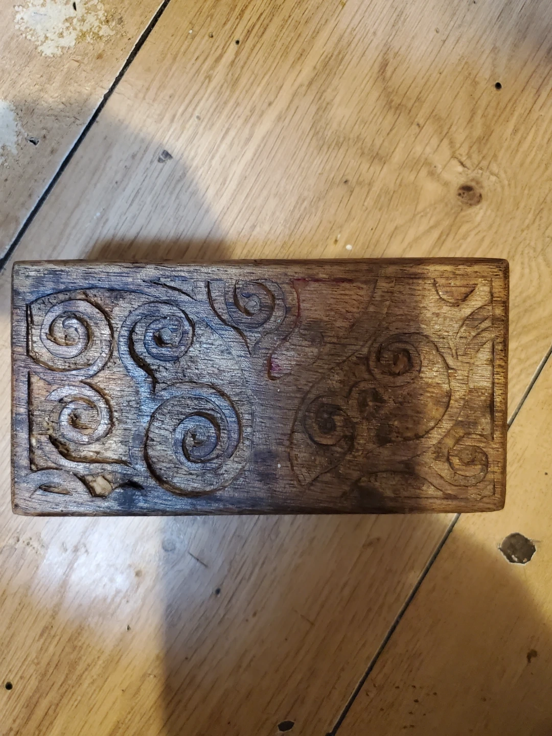 This is a solid wooden box with intricate carved detailing. It's perfect for storing small trinkets or keepsakes. The craftsmanship is evident in its unique swirling patterns.