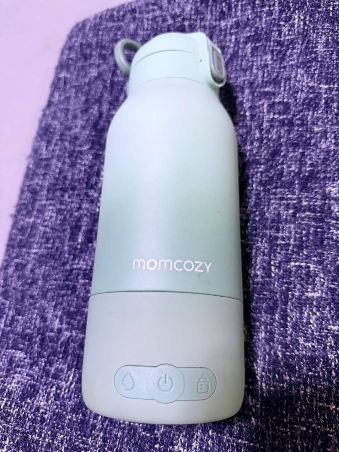 This is a Momcozy portable milk and water warmer in a light green colour. It's great for warming milk or water on the go. It has a secure lid and easy-to-use controls.