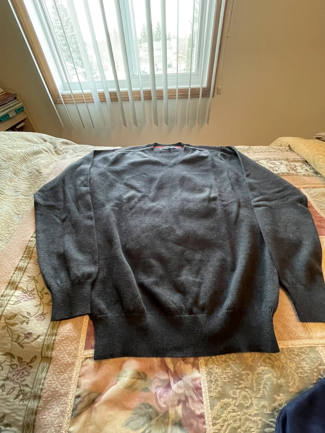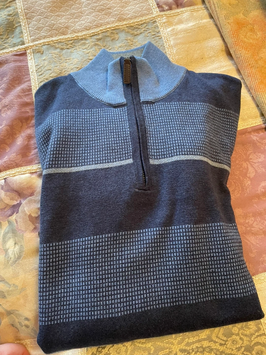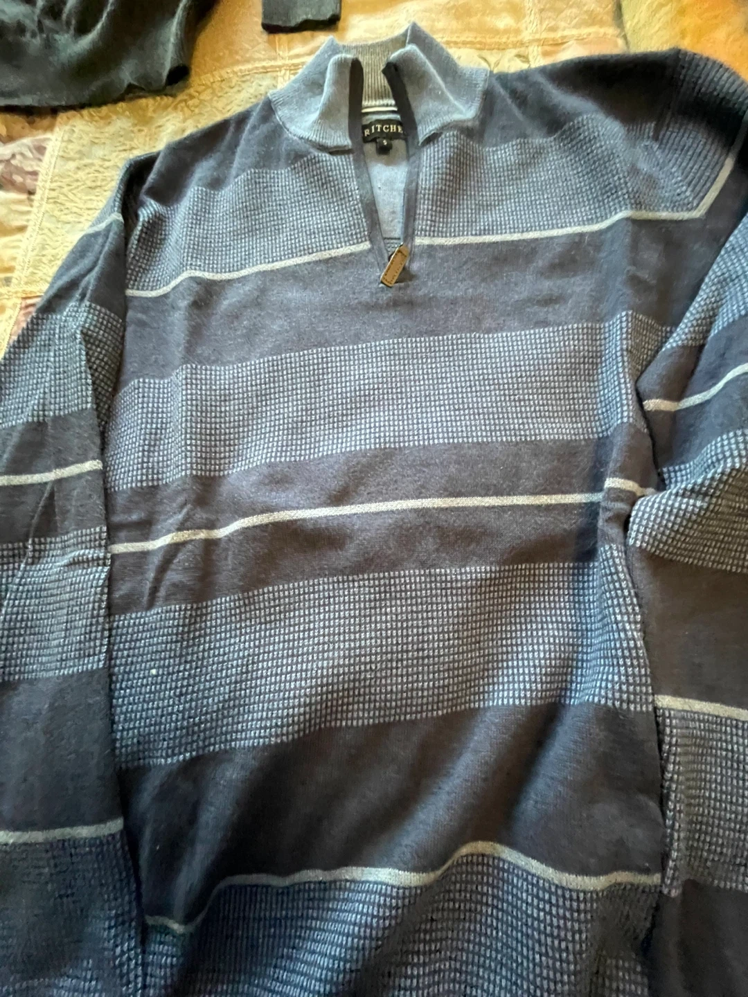 This RITCHIE sweaters features 2 at 1/4 zipper neckline and a striped pattern. It's made from a blend of materials for comfort and warmth. A great layering piece for cooler weather selling all together or if you only want one can negotiate a price Color’s grey and blue cash only please no e-transfers thank you