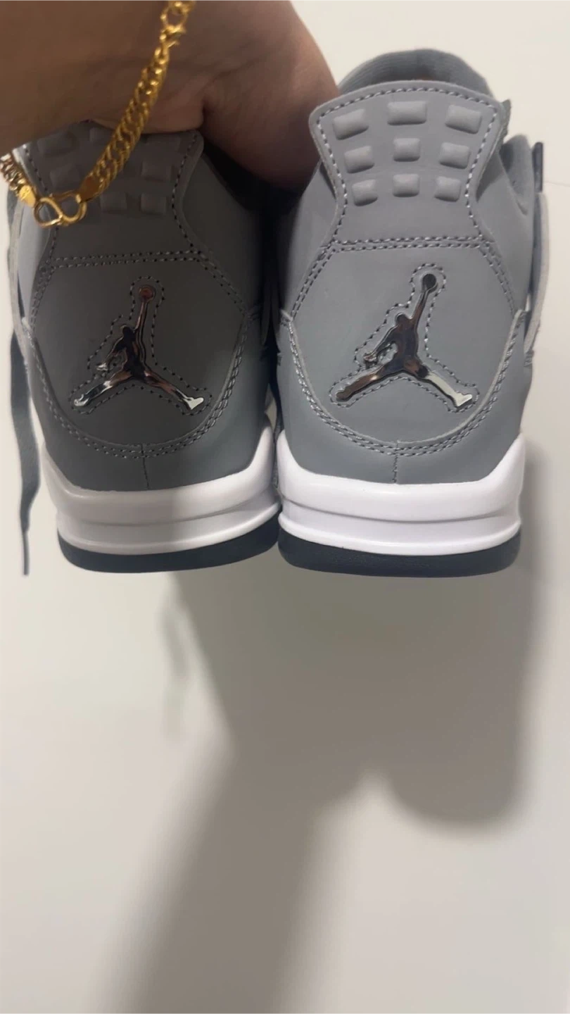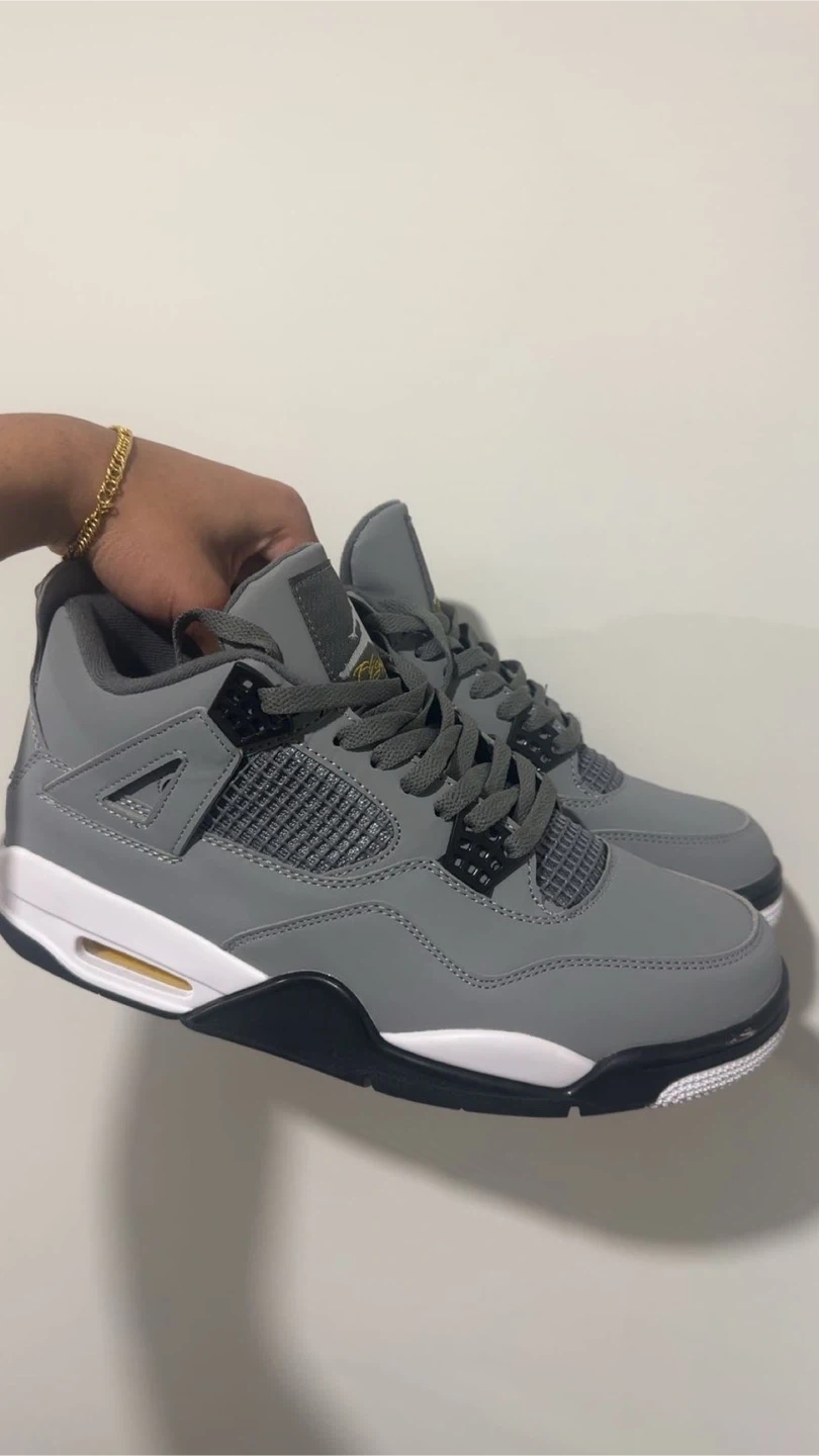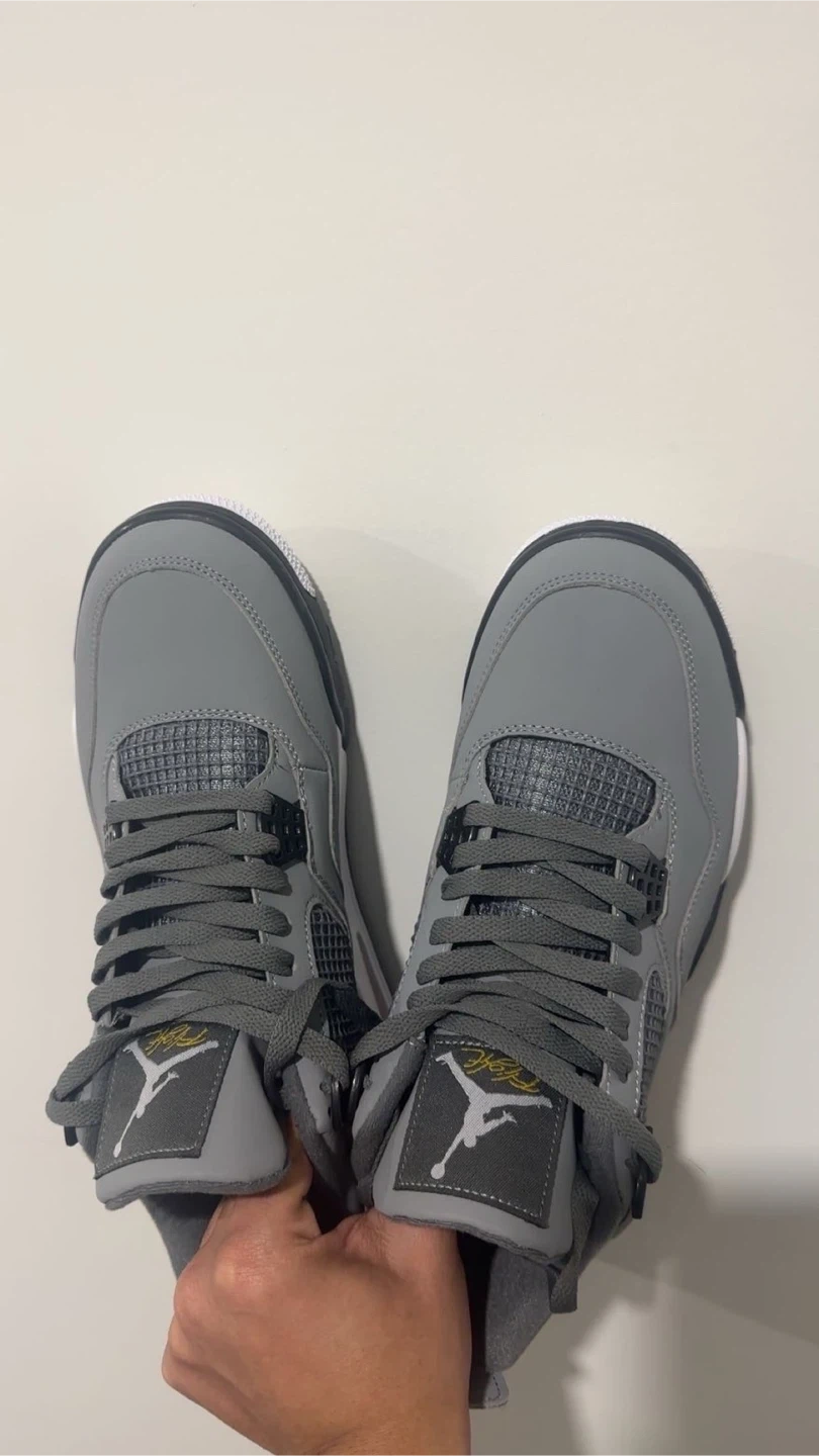 These Air Jordan 4 sneakers are a cool grey with black and white accents. They feature a Jumpman logo on the heel and tongue. Rubber sole provides traction.