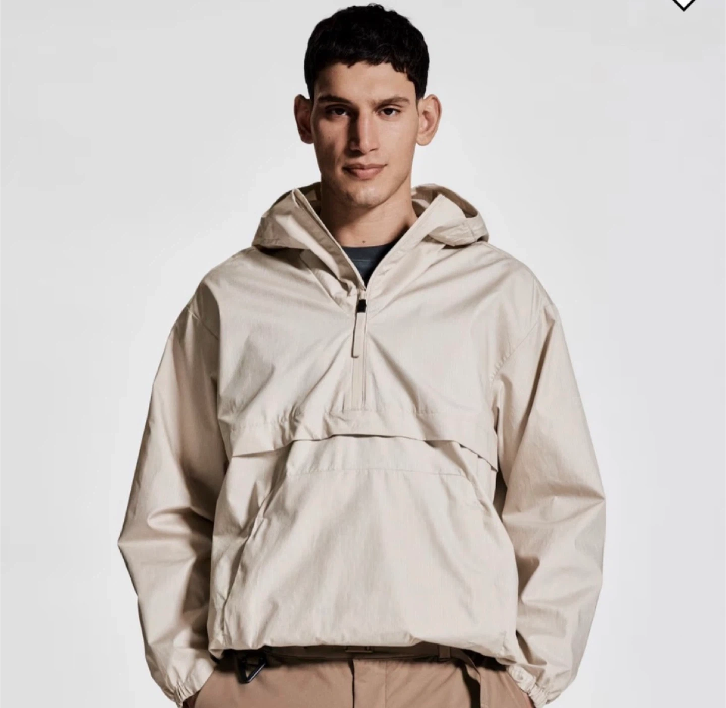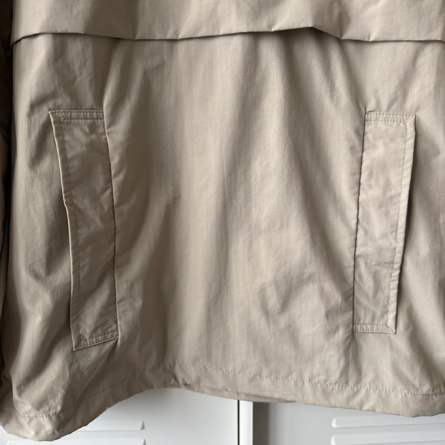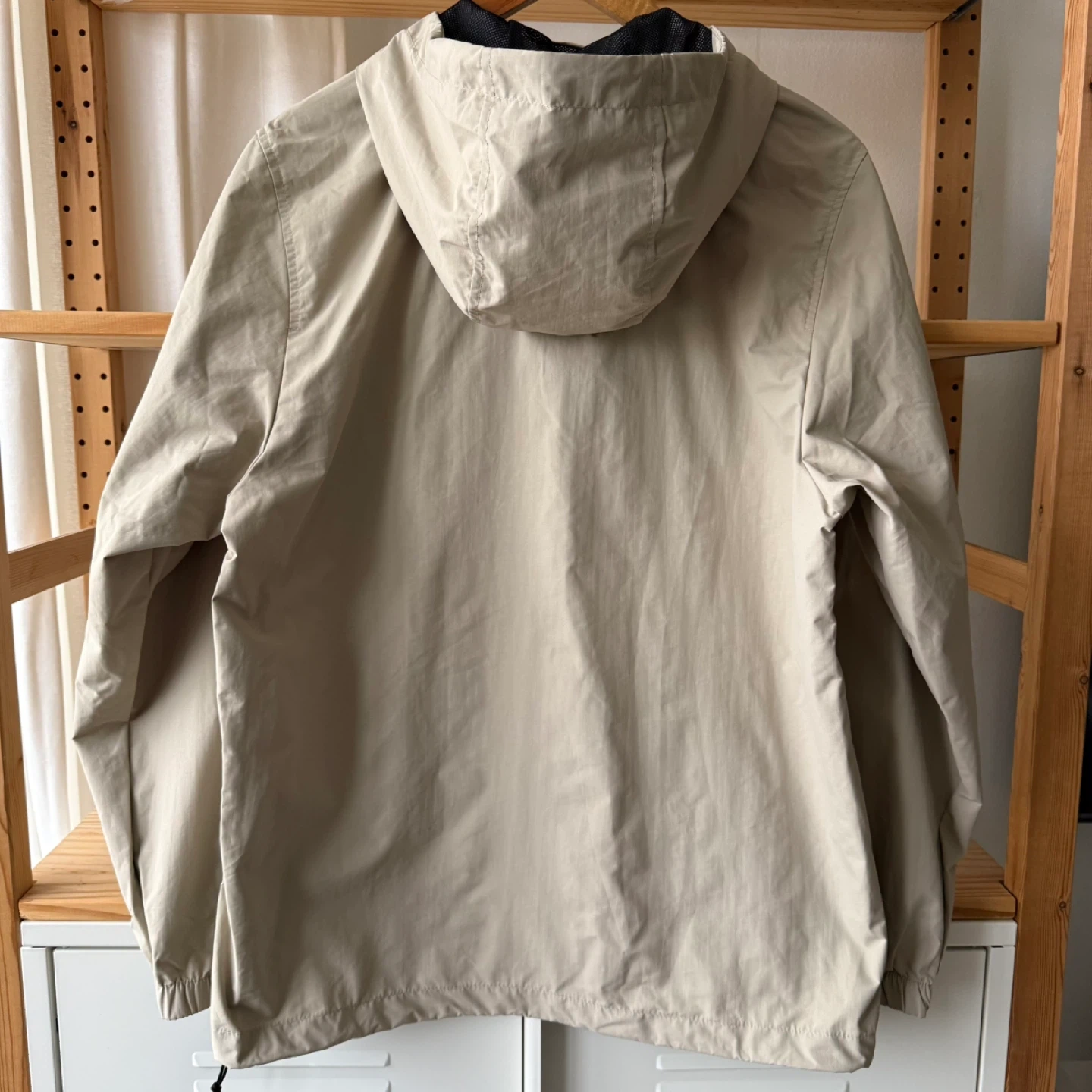 Light tan anorak windbreaker with hood. Ideal for casual wear. Stylish and functional.