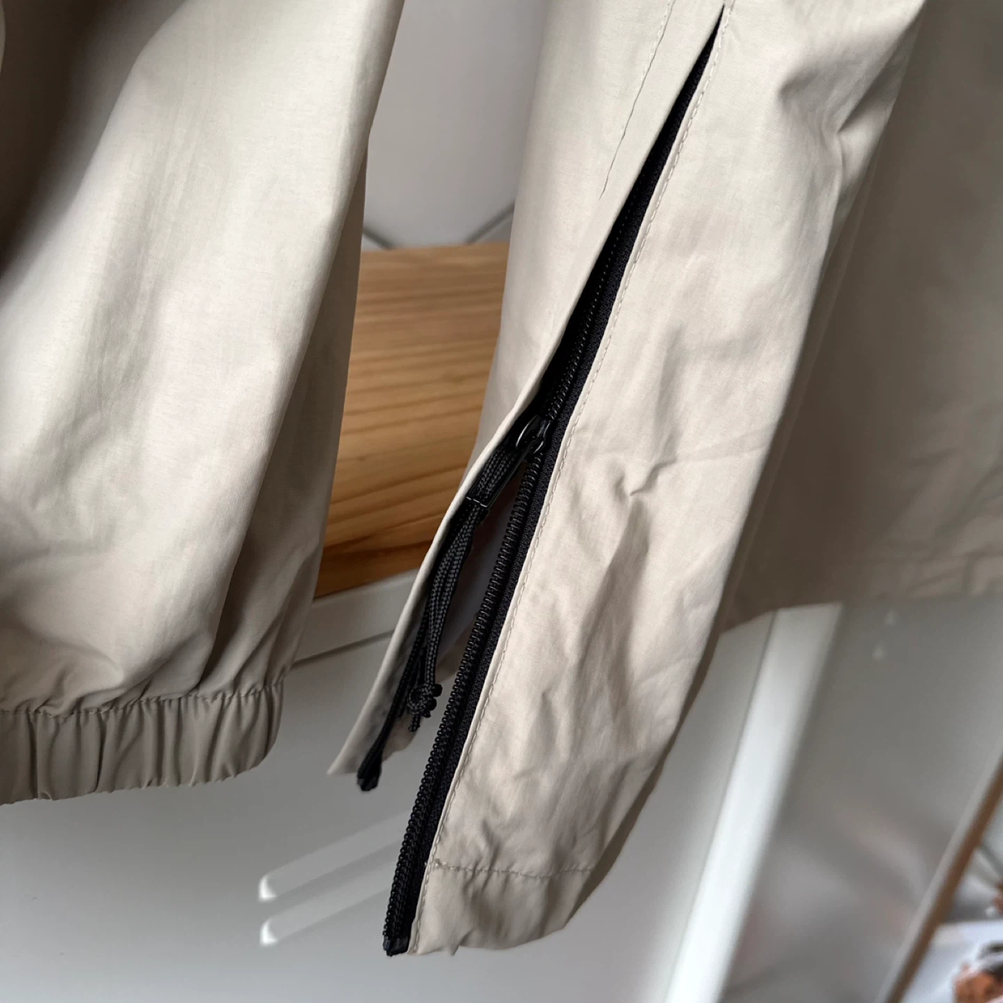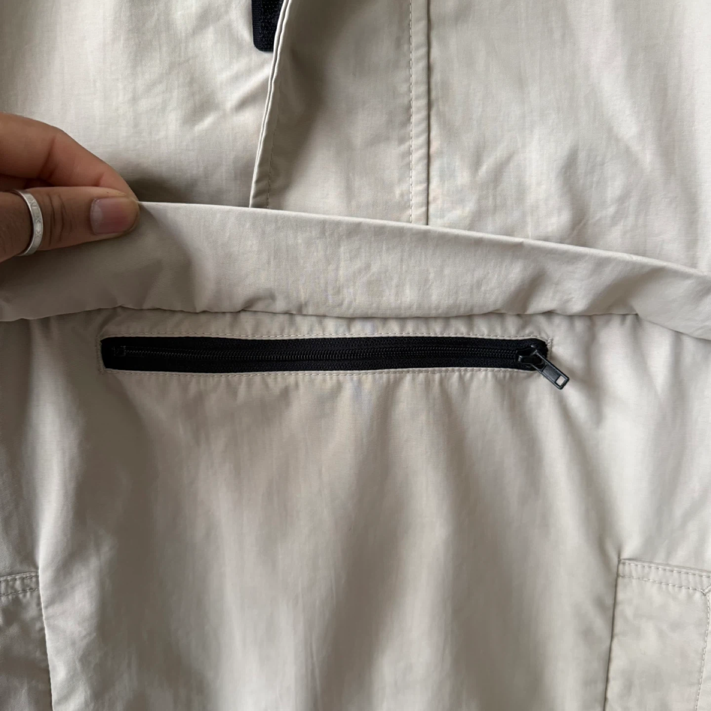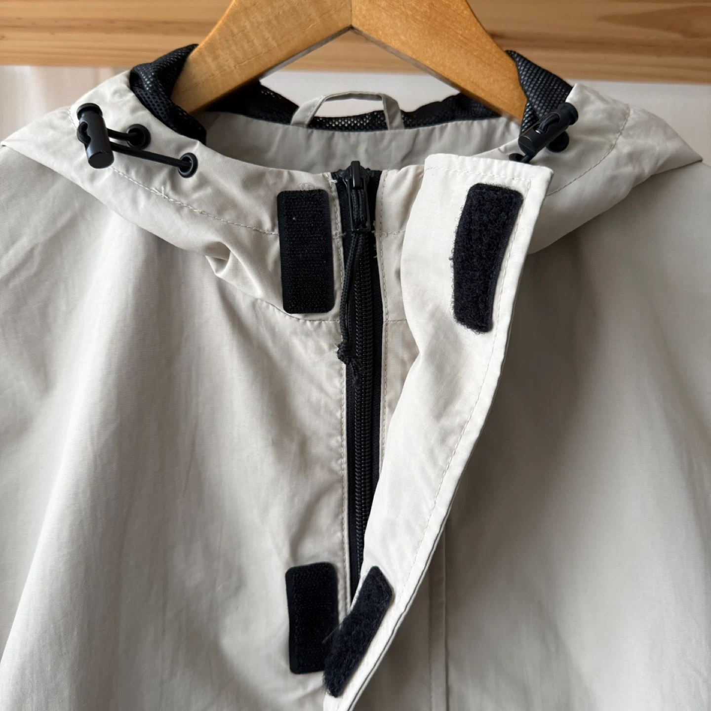 Light tan anorak windbreaker with hood. Ideal for casual wear. Stylish and functional.