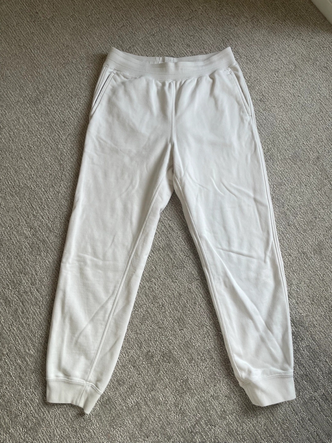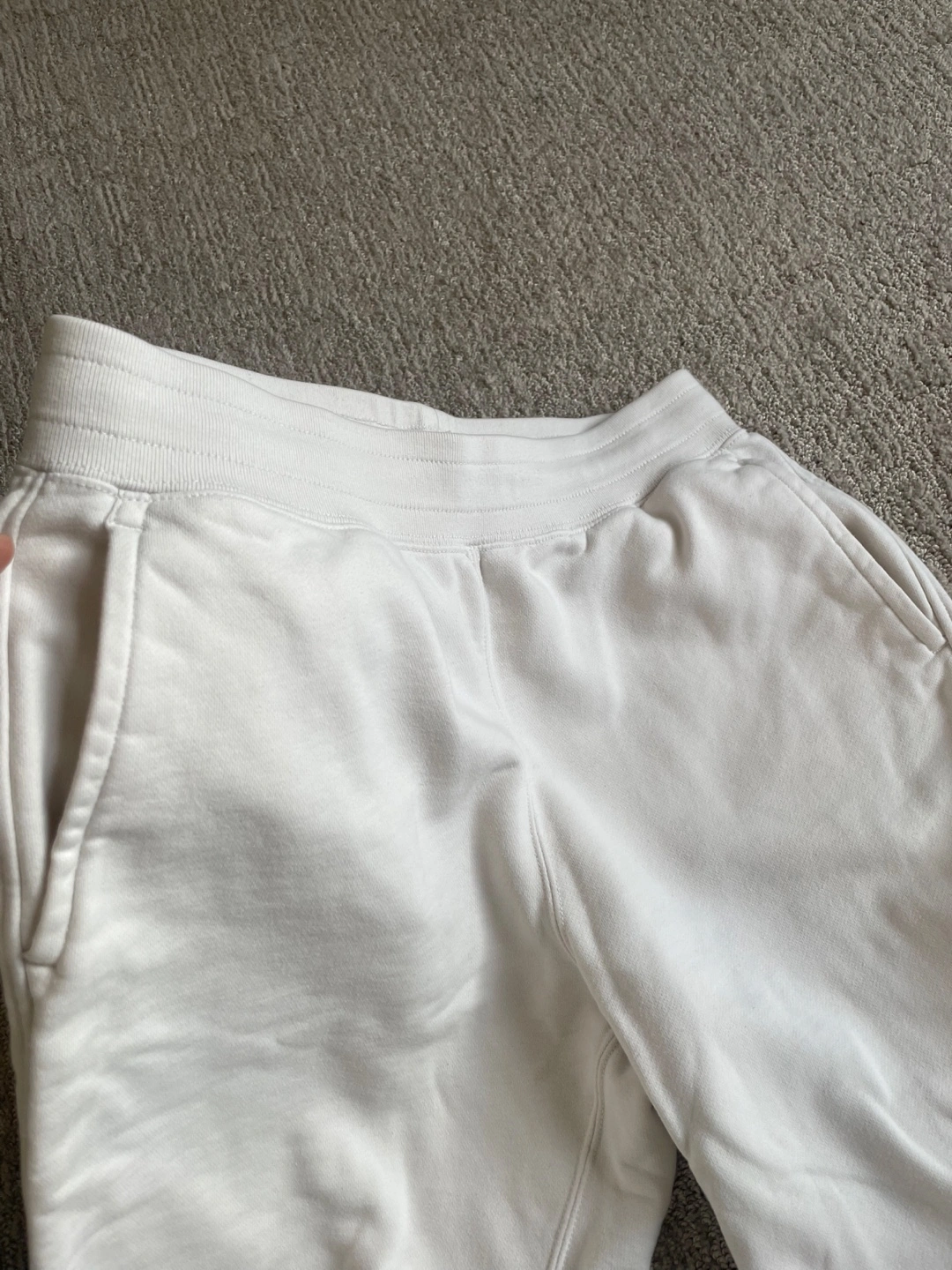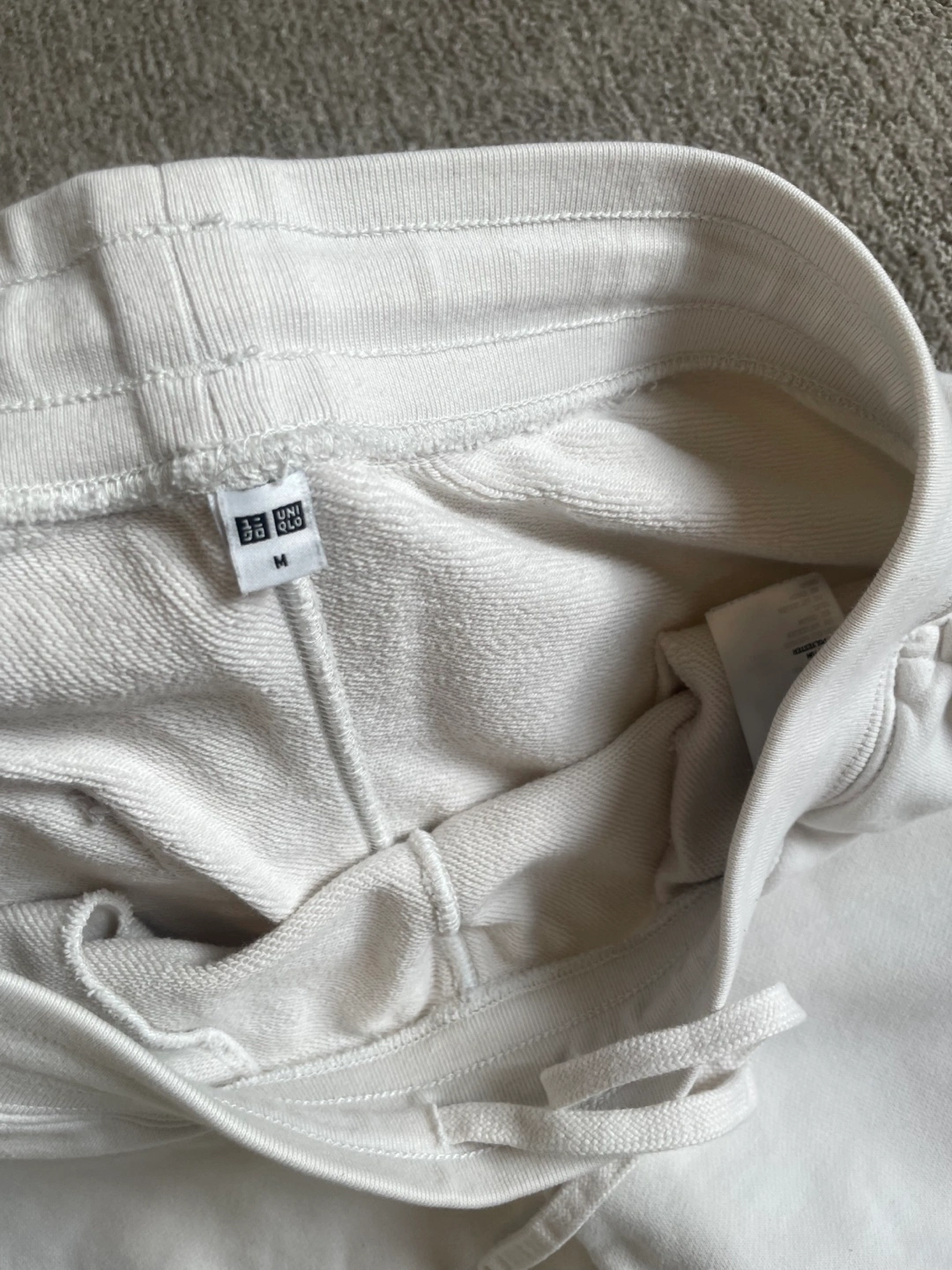These UNIQLO sweatpants are a versatile cream colour. They're made from a comfortable cotton blend and feature an elastic waistband with a drawstring. A back pocket adds extra convenience. These are great for lounging or casual wear!