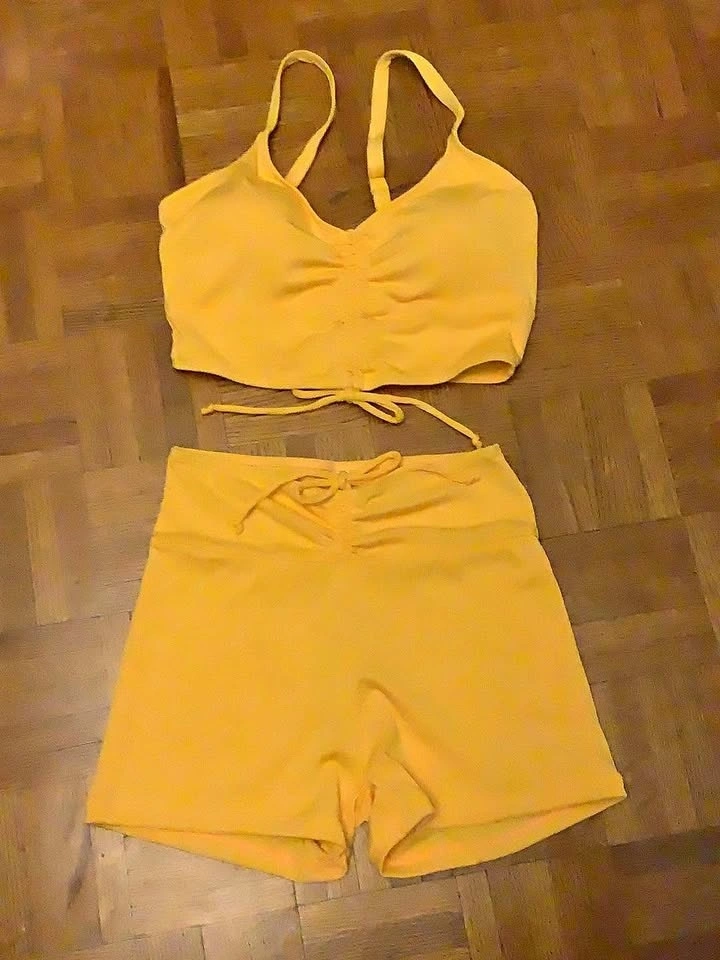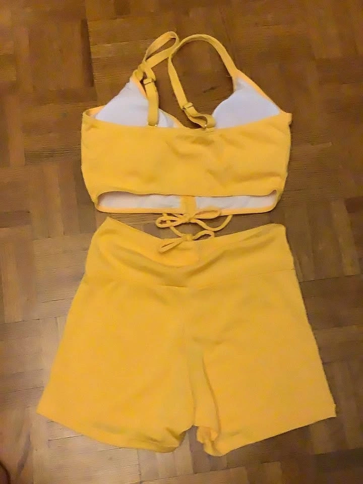 Brand new yellow 2-piece bathing suit. Tag says large but appears to be more of a small/medium. Bottoms are shorts and features a tie-up design on both bottoms and top. Smoke-free, cat-friendly home.