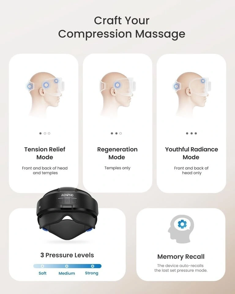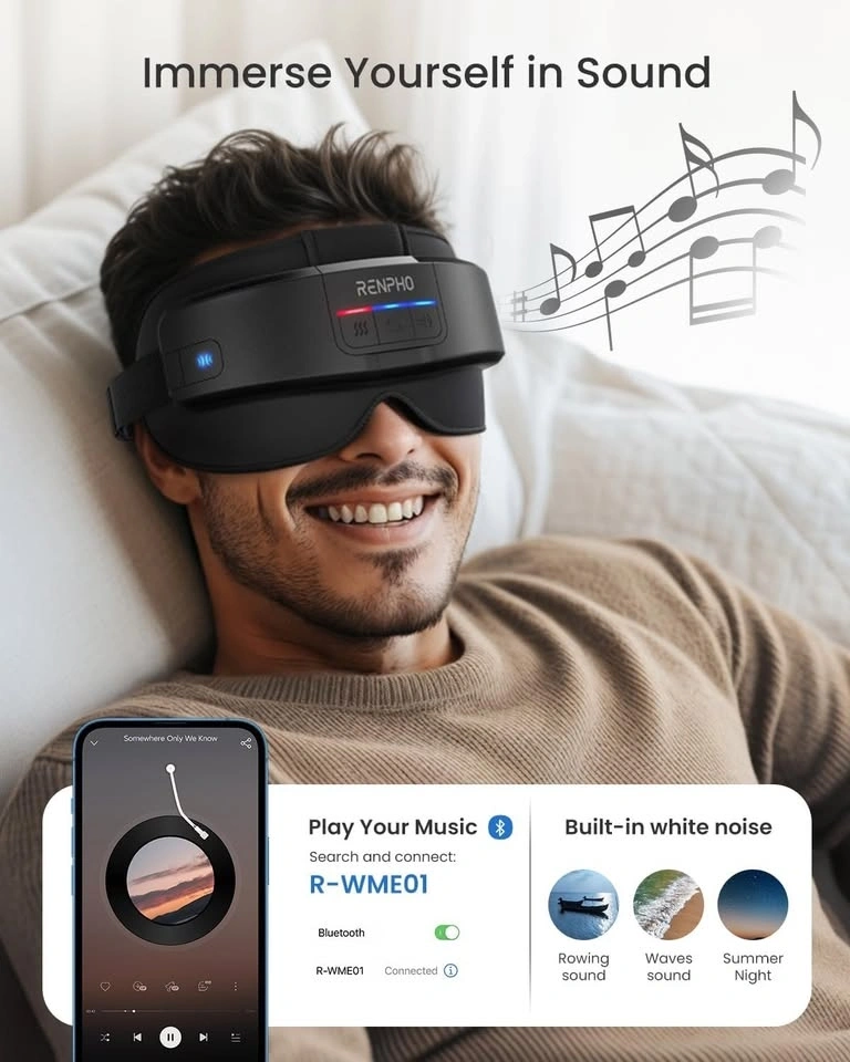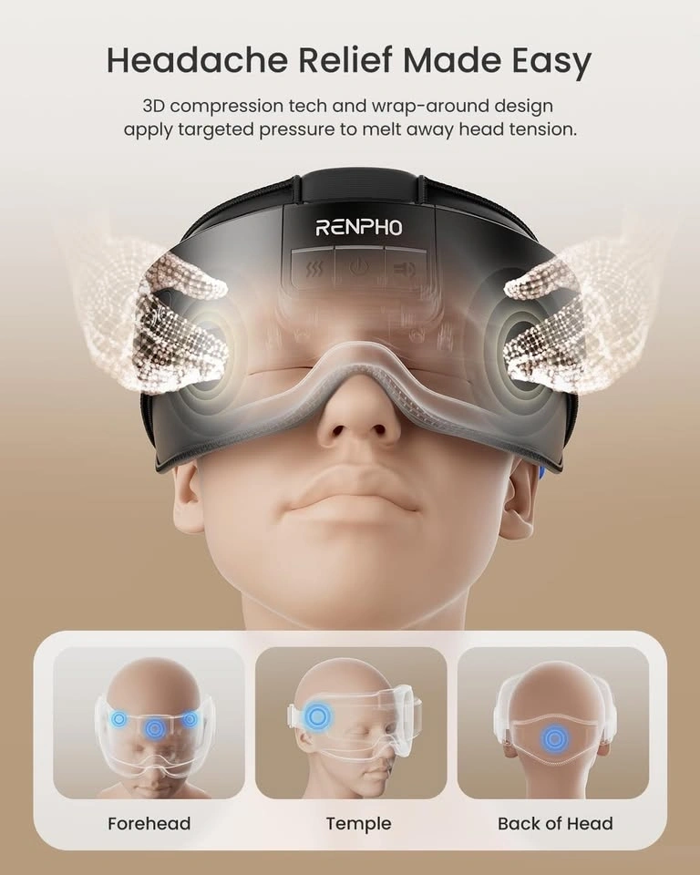 RENPHO Eyeris Masc Heated Head & Eye Mask, Headache Mask for Forehead, Back of Head and Temple. Experience comfort with the Eyeris Masc Eye & Head Massager, designed with sleek aesthetics and advanced technology. Utilizing 3D compression and a wrap-around structure, it targets your forehead, temples, and the back of your head to alleviate tension effectively. Tailor your relaxation with two heat options: 113°F (45°C) and 118°F (48°C). The heated eye mask soothes tired and dry eyes, especially after prolonged screen exposure, providing a customized warmth experience. Crafted to create the perfect sleep environment, the Eyeris Masc effectively blocks out light, ensuring complete darkness for deep, uninterrupted rest. The opaque material guarantees that no intrusive light disrupts your slumber, allowing you to drift off peacefully. Indulge in a customized session with three massage modes, three pressure levels, two heat settings, and three auto-off timers. This device allows you to adjust intensity and temperature to suit your preferences perfectly. Plus, with a memory function, it recalls your last settings automatically. Enhance your relaxation with pre-recorded tracks or connect via Bluetooth to play your favorite playlist. For those who prefer silence, simply switch to silent mode for an uninterrupted massage. Equipped with a 1500mAh rechargeable battery, the Eyeris Masc provides extended usage without the need for frequent recharging. Enjoy 1.5-hour fast charging, ensuring your massager is always ready when you need it. The included storage bag makes it easy to transport your temple massager wherever you go. Its adjustable headband ensures a comfortable fit for everyone. Ideal for your morning routine, office breaks, bedtime relaxation, or travel, this versatile massager is the perfect companion and an excellent gift choice. Product dimensions: 5.59 x 4.72 x 7.87 inch (14.2 x 12 x 20 cm). Product weight: 293 g. Thermal range: 113-118°F (45-48℃). Power supply: USB Type-C (included). Input: DC 5V 2A. Battery capacity: 1500mAh. Charging time: 90 minutes. USB-C charging cable included.