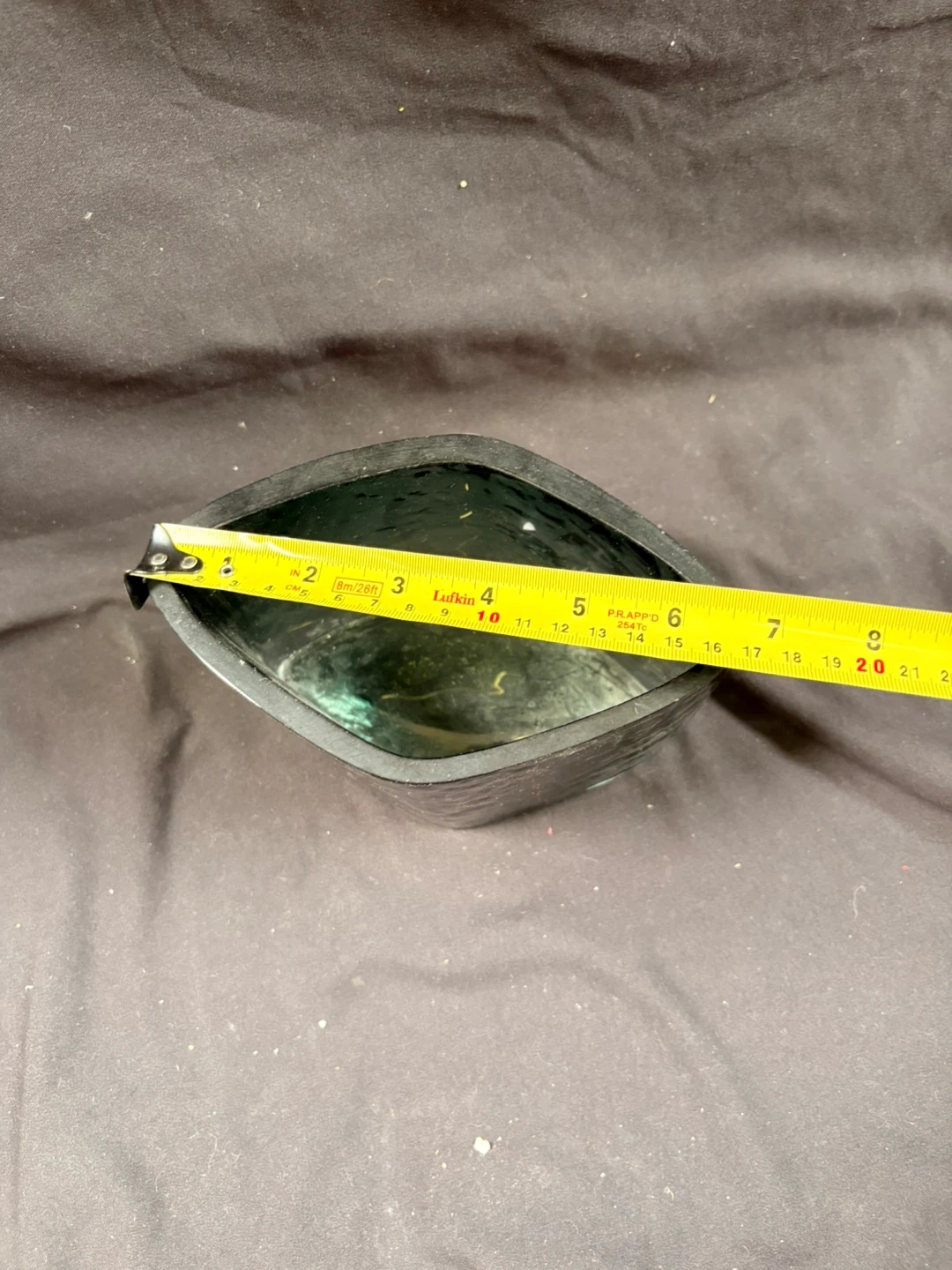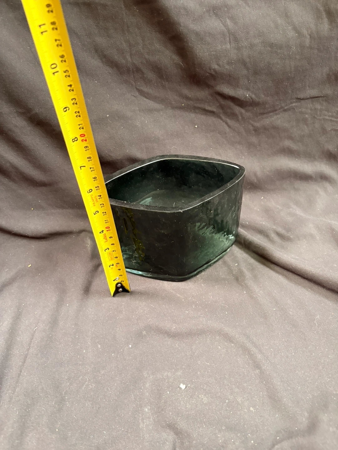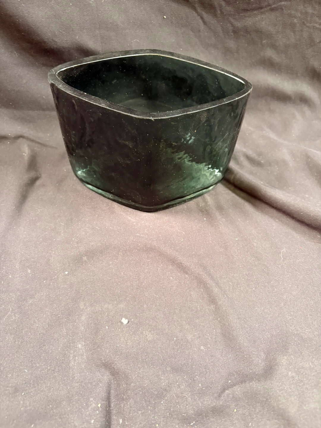 This is a dark green glass dish with a textured exterior. It's square with slightly rounded corners. Measures approximately 6 inches across and 4 inches high.